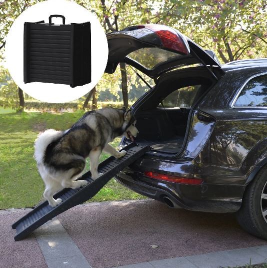 ezért a legtöbb háziállat számára alkalmas. A rámpa erős műanyagból készül. Ez különösen stabil és könnyen tisztíthatóvá teszi. Az oldalsó biztonsági határok és a csúszásmentes lépcsőfelület segít a négylábú barátjának.  Ha nincs használatban, a rámpát egyszerűen fel lehet hajtani, és könnyen el lehet helyezni az autójába.