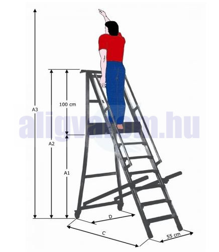 Összecsukható komissiózó létra alumíniumból, 11 lépcsőfokkal, munkaállvánnyal