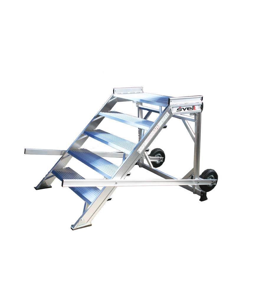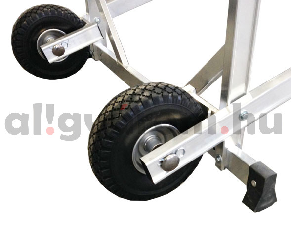 Professzionális, egyoldalas, nagyméretű, defektbiztos kerekekkel ellátott fellépő, a felhasználó igényei szerint választhatja ki a kívánt szélességet és magasságot, a 20 cm mély, lapos lépcsőfokok kényelmesek, szélesek és csúszásmentesek.