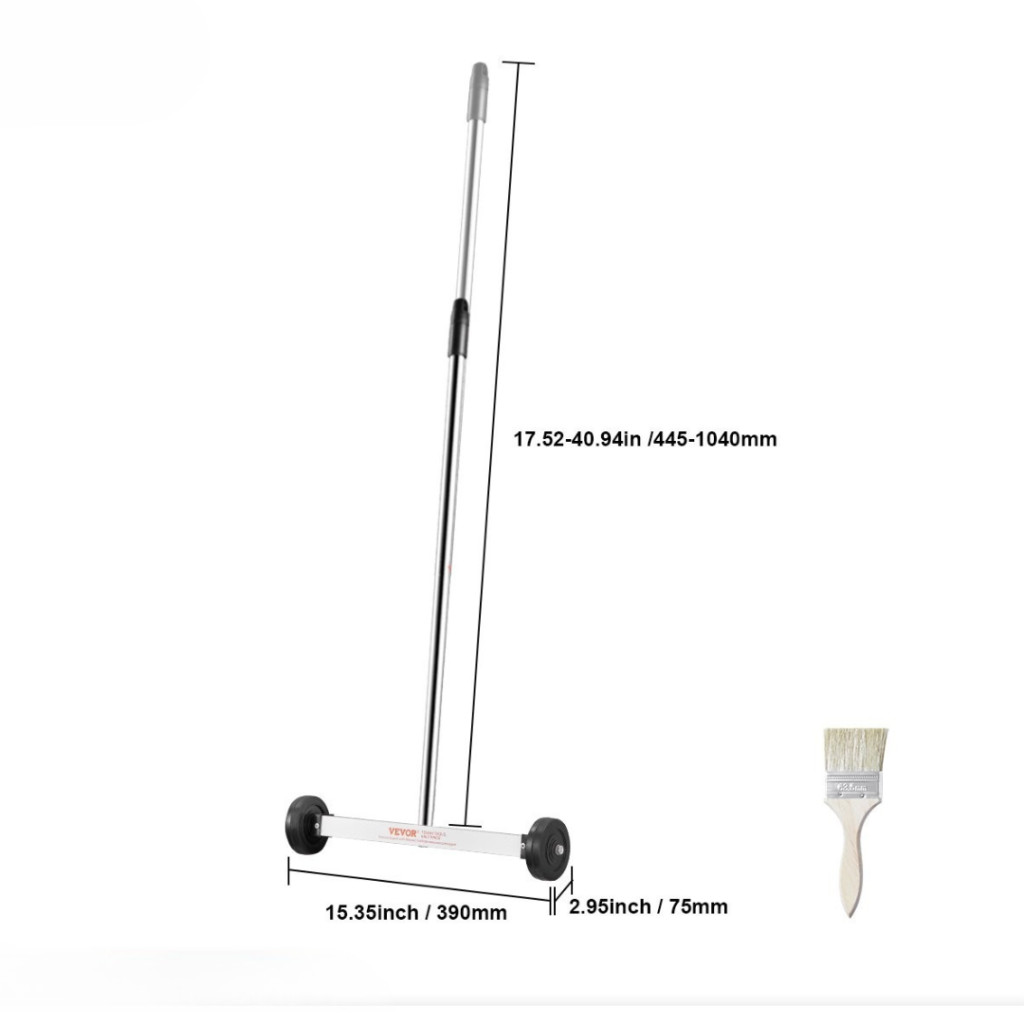 A könnyű, mindössze 1,01 kg-os súlyának köszönhetően a mágneses seprőgép rendkívül praktikus és könnyen kezelhető. A teleszkópos nyél 44,5 cm és 104 cm között állítható, így kényelmes munkavégzést biztosít különböző testmagasságú felhasználók számára, valamint megkönnyíti a szűk helyeken való munkát.