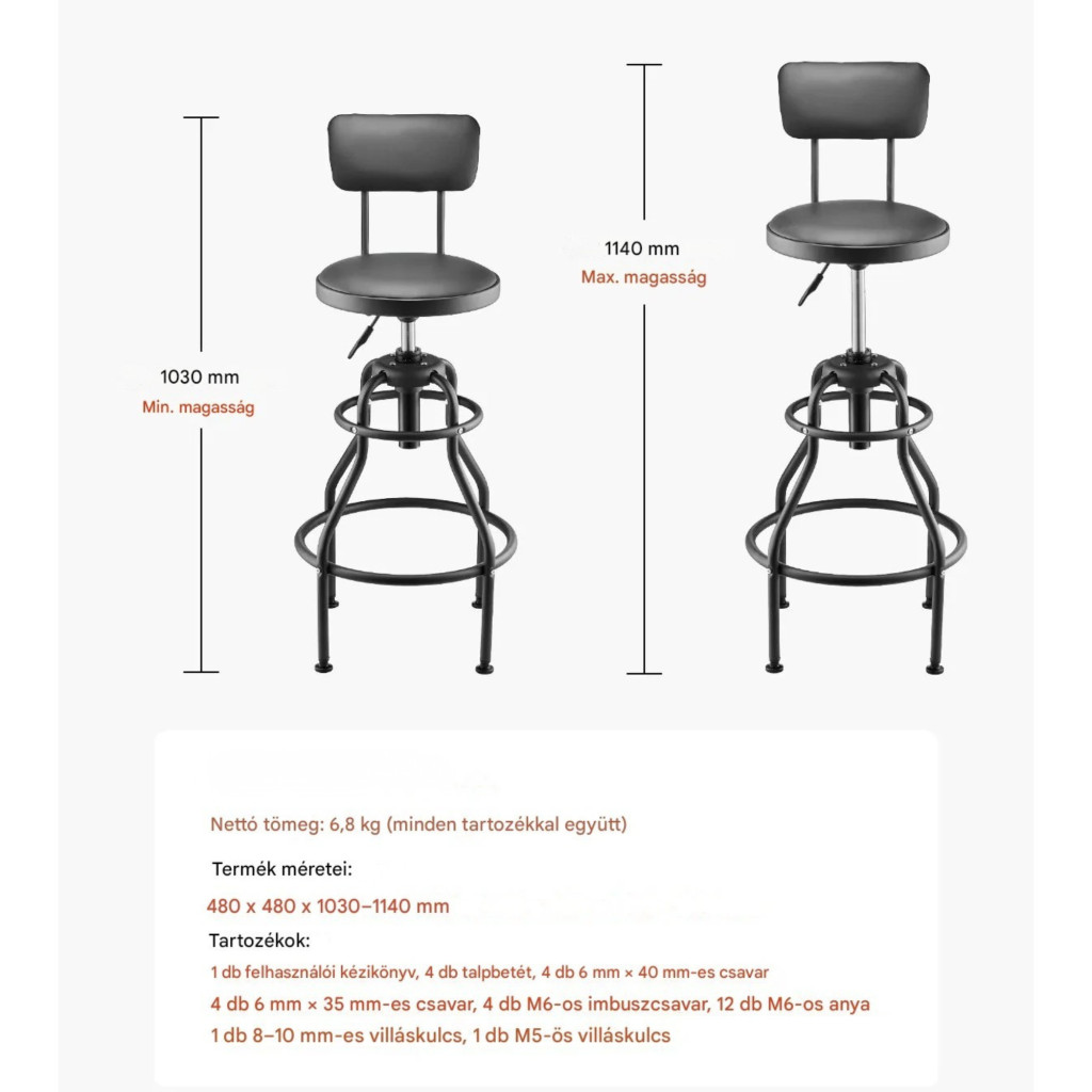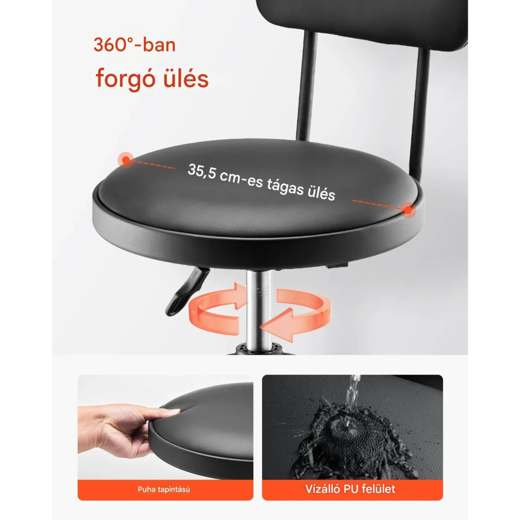 Funkciók: magasságállítás, 360° forgás, háttámla