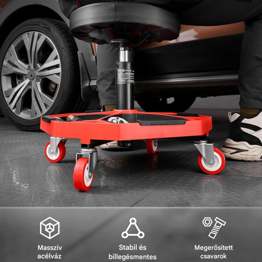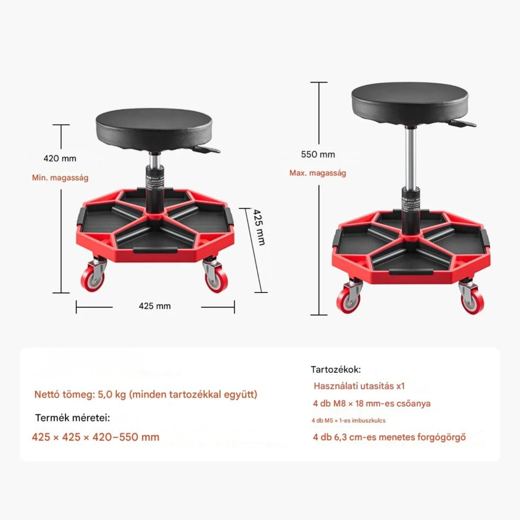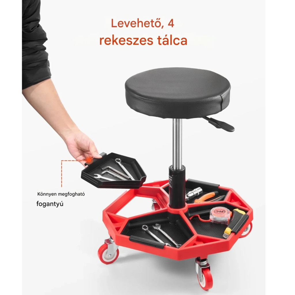 Gurulós műhelyszék szerszámtárolóval 136 kg teherbírás, állítható magasság fekete-piros