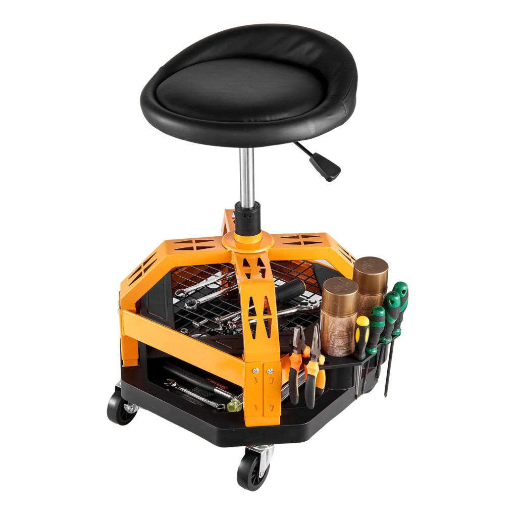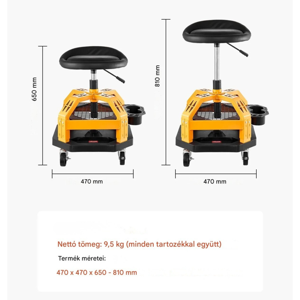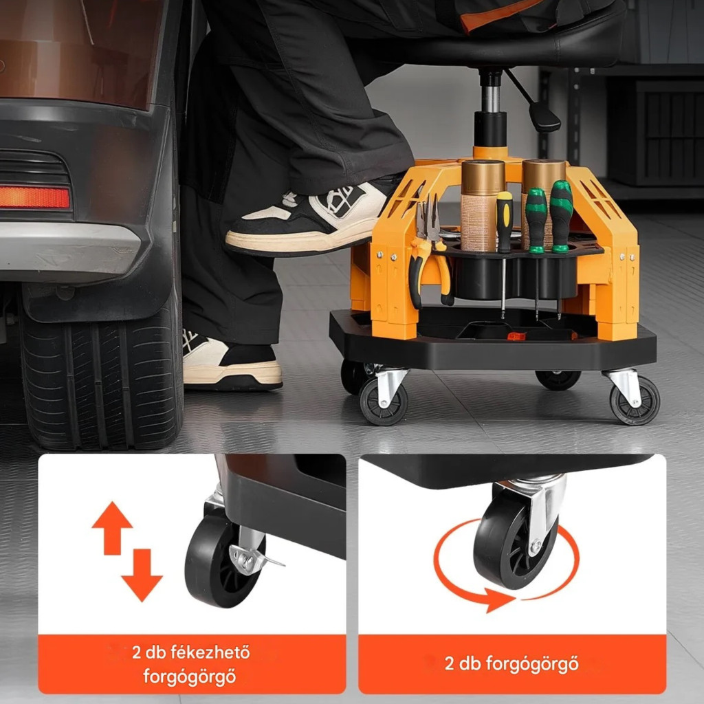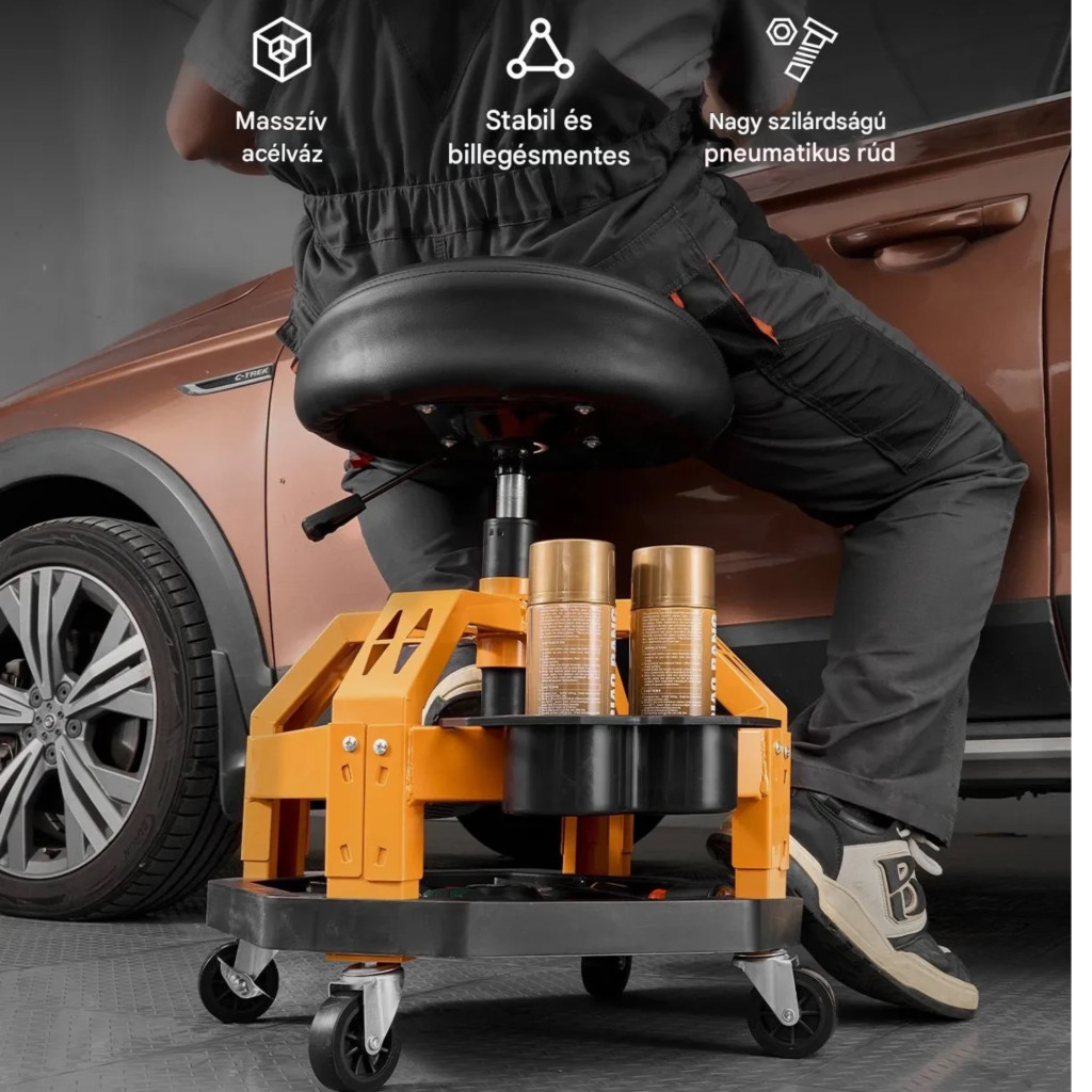 Ez a sokoldalú gurulós műhelyszék ideális választás minden olyan felhasználó számára, aki kényelmesen, hatékonyan és rendszerezetten szeretne dolgozni. A modern kialakítás, az ergonomikus ülés és a praktikus tárolási lehetőségek együttesen biztosítják a gördülékeny munkavégzést akár garázsban, akár műhelyben.