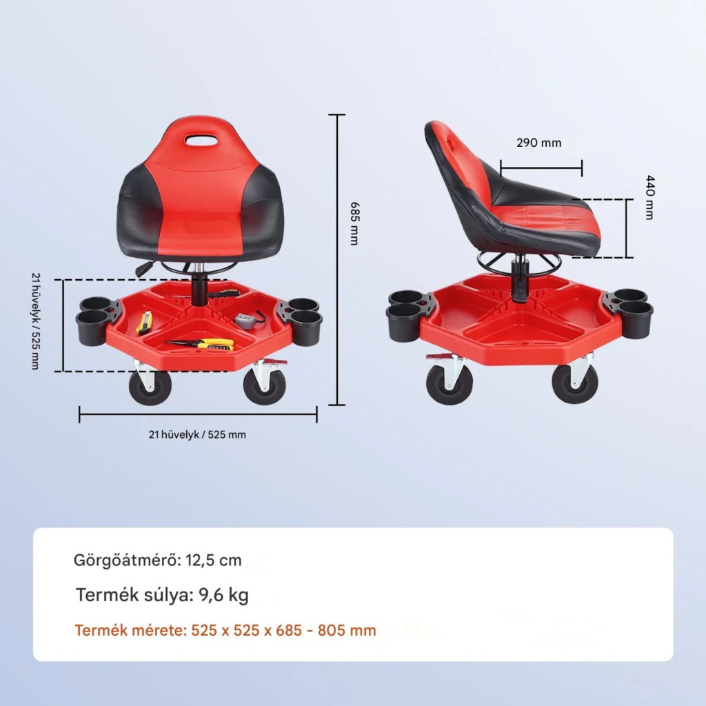 Ez a professzionális kialakítású gurulós műhelyszék ideális választás, ha Ön kényelmesen és hatékonyan szeretne dolgozni műhelyben, garázsban vagy akár kültéren. Az állítható magasság, a stabil szerkezet és a praktikus tároló lehetővé teszi, hogy minden szükséges eszköz kéznél legyen, miközben kíméli a testét.