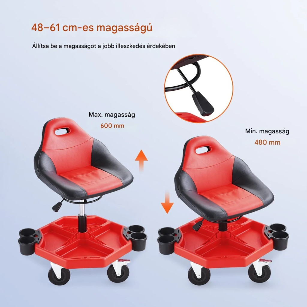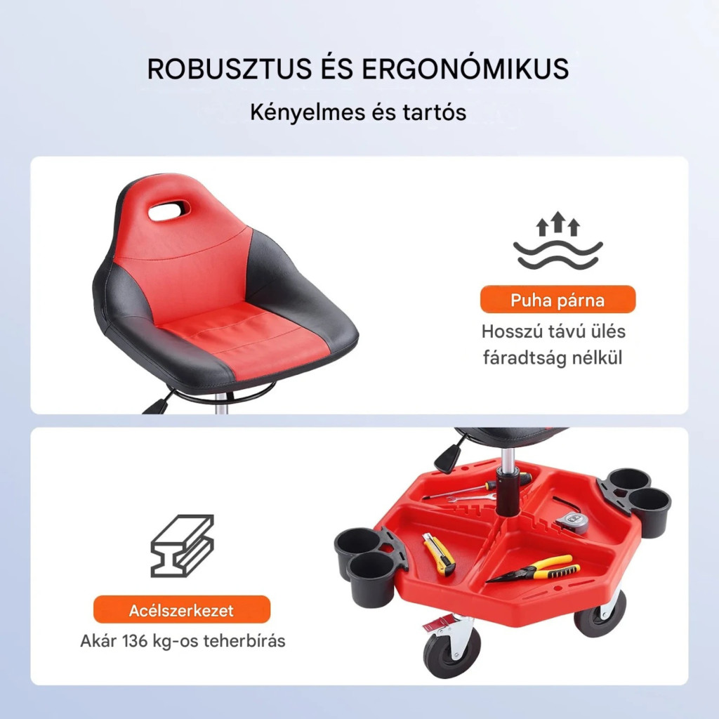 Állítható magasságú gurulós műhelyszék 136 kg teherbírás, fékezhető kerekekkel piros