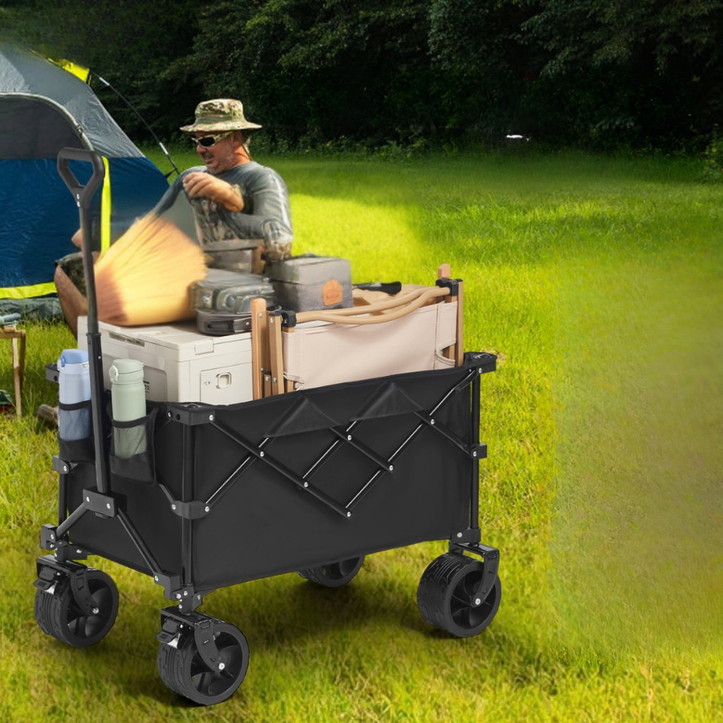 A fékes kialakítás, az állítható fogantyú, valamint a praktikus tárolózsebek és pohártartók révén ez a modell kiemelkedik a hétköznapi kézikocsik közül. Megbízható megoldás minden szabadtéri programra – kertészkedéshez, kiránduláshoz, horgászathoz vagy nyaraláshoz egyaránt.