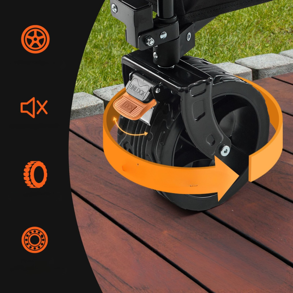 A 600D Oxford szövet PVC-bevonattal vízálló és könnyen tisztítható, míg a masszív porszórt vasváz biztosítja a szerkezet stabilitását még gyakori, intenzív használat mellett is. A 13 cm átmérőjű, 360°-ban forgatható PVC kerekekbármilyen felületen – homokon, füvön vagy kavicson – is jól boldogulnak. A beépített fékrendszer biztonságosabbá teszi a használatot megálláskor vagy lejtős területen.