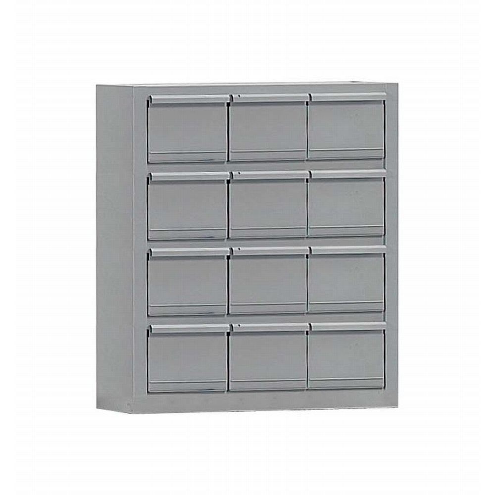 Acél alkatrésztároló fiókos szekrény rendkívül masszív szerkezet, 12 nagyméretű acél fiókkal ellátott. Alapfelszereltségként fiókonként egy acél osztóelem áll a rendelkezésre. A fiókok kialakításának köszönhetően 5 részre is oszthatóak igény szerint.