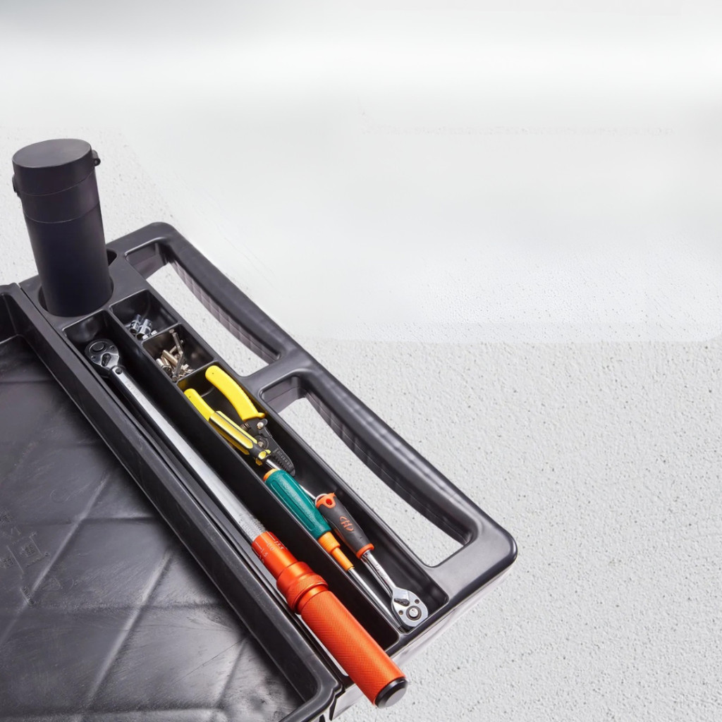 Az oldalsó rögzítőfuratok lehetőséget adnak horgok vagy kiegészítők elhelyezésére, így szerszámok, kábeltekercsek vagy egyéb kiegészítők is rendszerezetten tárolhatók. Ezzel a szervizkocsival könnyedén létrehozhat egy mobil munkaterületet, ahol minden fontos eszköz egy helyen, kézközelben van.