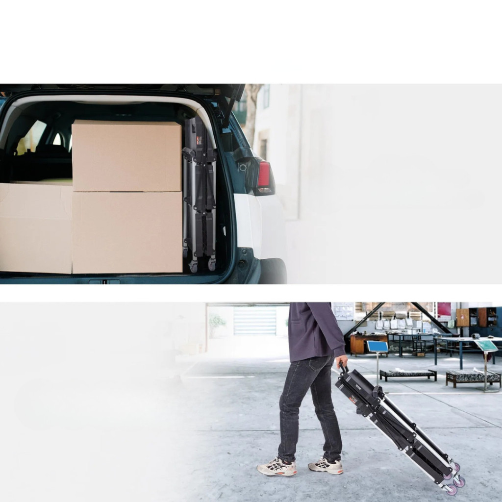 A kocsi innovatív szerkezetének köszönhetően mindössze 17 cm szélességűre összehajtható, így kényelmesen elfér a szekrényben, autó csomagtartójában vagy bármely kisebb tárolóhelyen. Az ergonomikus tolókar könnyű húzást biztosít, csökkenti a megterhelést és növeli a munkavégzés hatékonyságát.