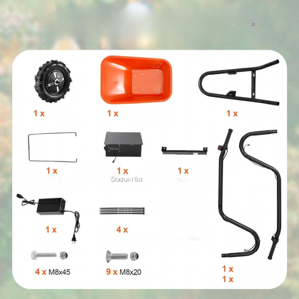 Az elektromos talicska részletes szerelési útmutatóval érkezik, minden szükséges alkatrészt és csavart mellékelve. Az összeszereléshez csak alap szerszámokra (villáskulcs, csavarhúzó) van szükség.