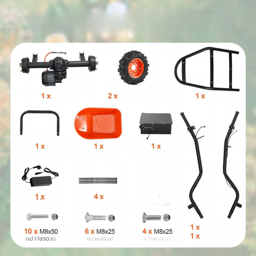 Az elektromos talicska összeszerelése egyszerű, az alapvető szerszámokkal (csavarhúzó, villáskulcs) rövid idő alatt elvégezhető. A praktikus ergonomikus fogantyúk kényelmes irányítást tesznek lehetővé, így a hosszabb munkavégzés sem fárasztó.