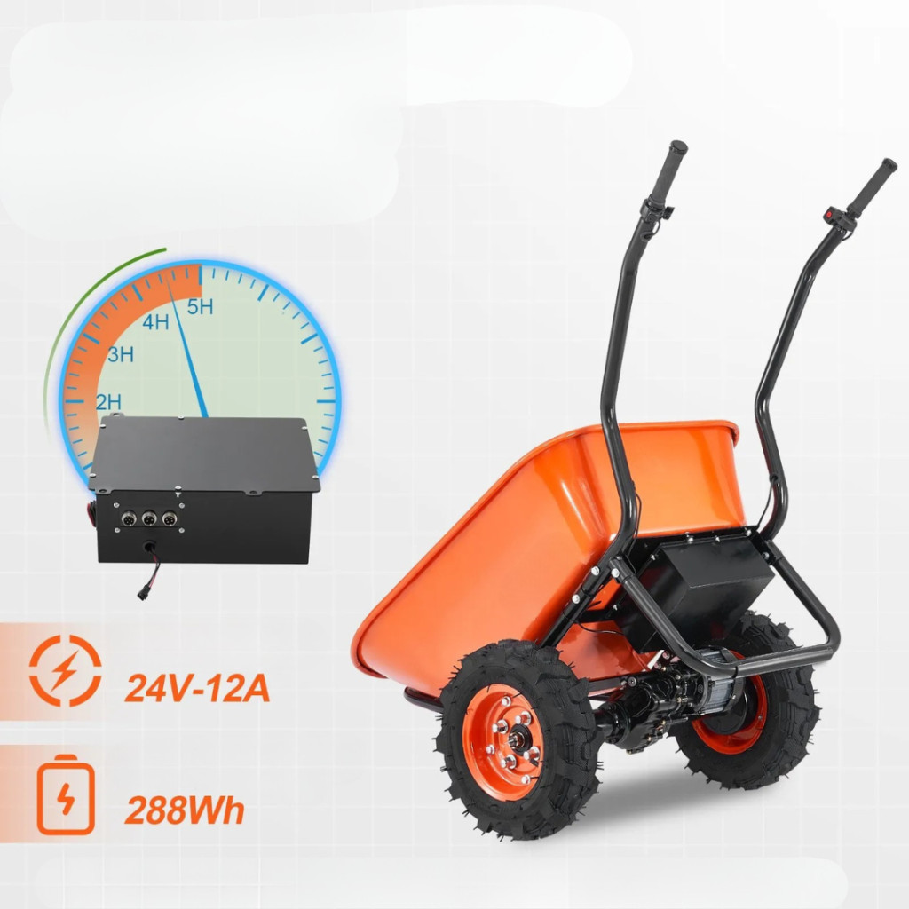 A talicska 24 V-os, 12 Ah-s mélykisütésű ólomakkumulátorral működik, amely 288 Wh kapacitással rendelkezik. Egyetlen feltöltéssel akár 2–5 órán át üzemeltethető, a terheléstől és a terepviszonyoktól függően. Ez ideális választás intenzív kerti vagy ipari munkákhoz is.