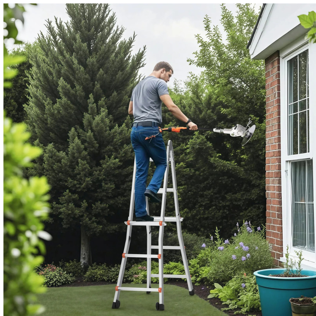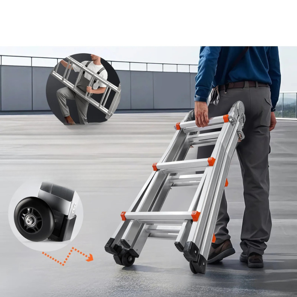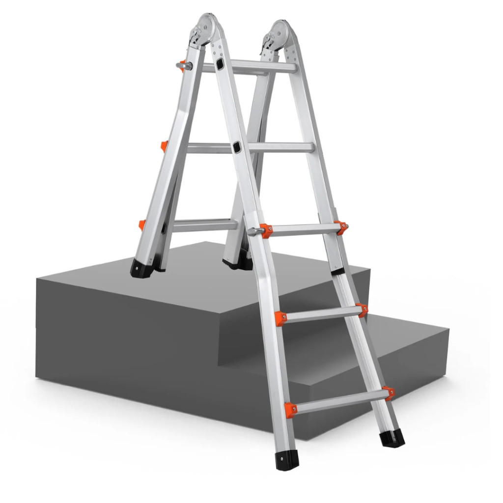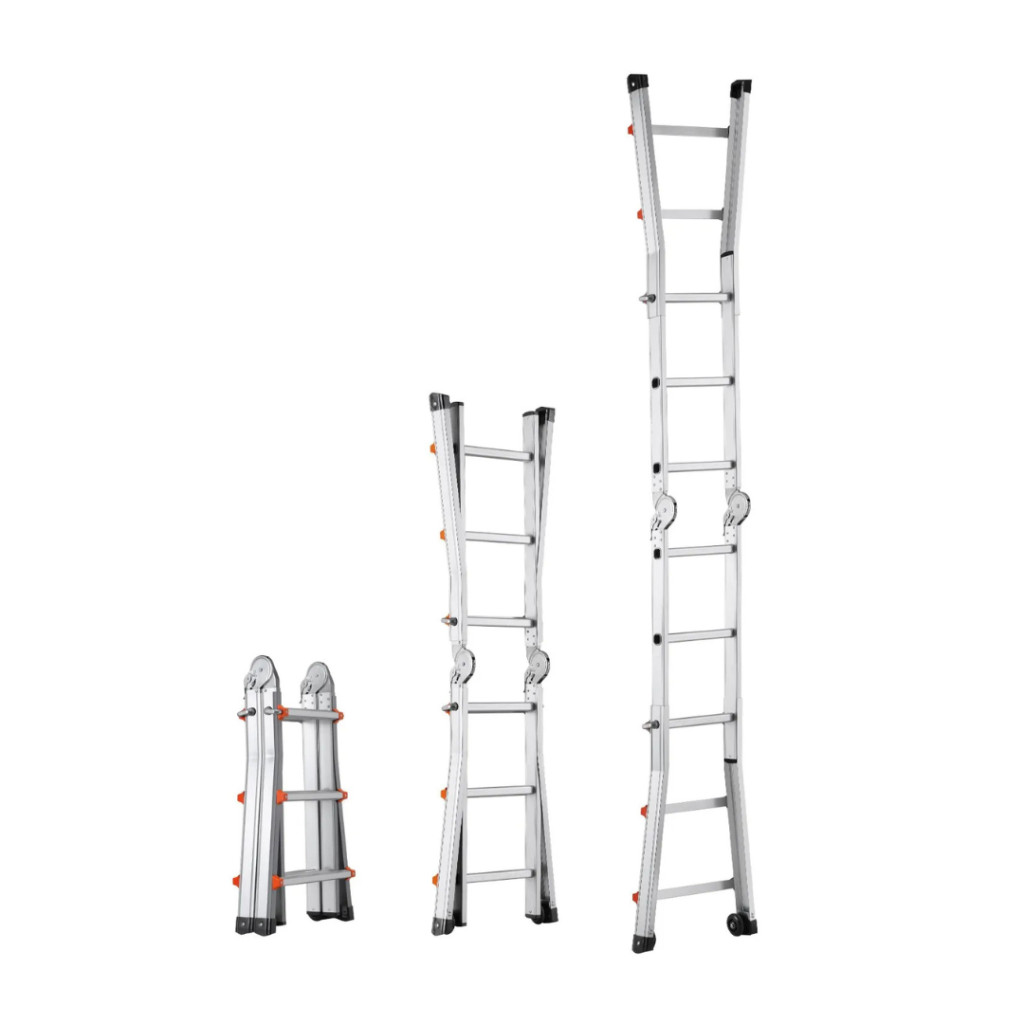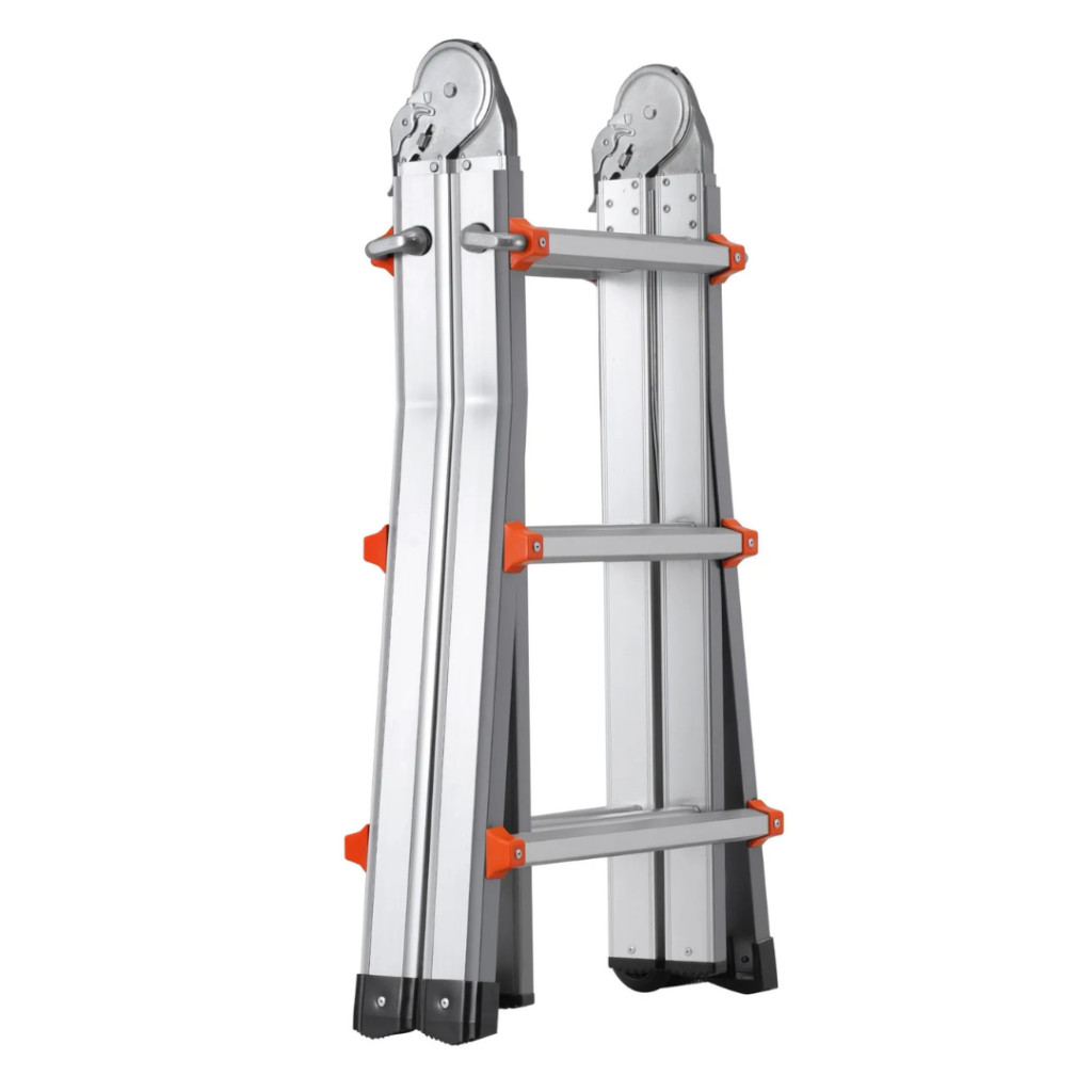 A teleszkópos lábak akár 180°-ban állíthatók, így a létra többféle konfigurációban használható. Teljesen kihúzva eléri az 512 cm-es magasságot, amely tökéletes választás tetőjavításhoz, karbantartási feladatokhoz, padlásfeljáráshoz vagy bármilyen magasban végzett munkához.