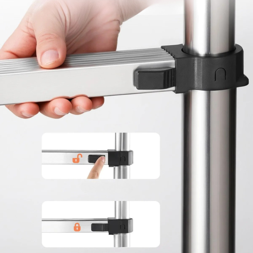 Az összecsukható létra minden fokán külön rögzítő mechanizmus található, így a magasság könnyen és biztonságosan állítható. A gombnyomásra működő zárórendszernek köszönhetően gyorsan és praktikusan beállíthatja a kívánt pozíciót.
