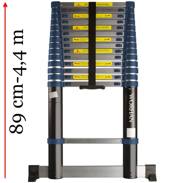 4,4 m magas, teleszkópos alumínium létra alumínium fokokkal, 89 cm-re összecsukható. Széles támasztólábbal