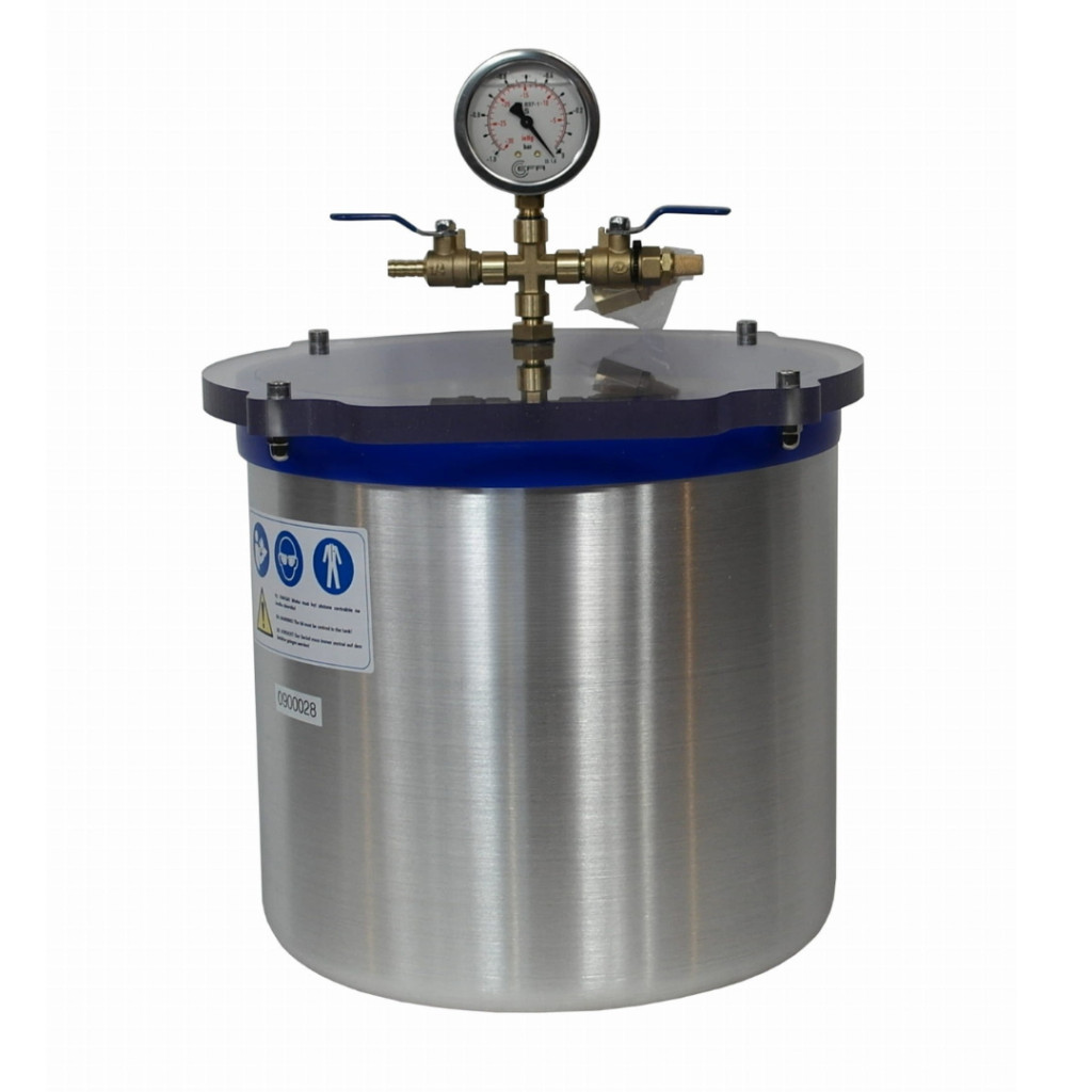 A kamra teste alumíniumból készült, űrtartalma 12,5 liter, belső méretei: átmérője 25 cm, magassága 23 cm. A fedél vastag polikarbonátból készült. A kamra vulkanizált szilikon tömítéssel van ellátva. Az alkalmazott tömítés megbízható és alacsony érzékenységű a mechanikai deformációra. A fedél kiváló átlátszósága lehetővé teszi a gáztalanítási folyamat megfigyelését. Két golyósszelep lehetővé teszi a gáztalanítási folyamat szabad szabályozását, a felszerelt glicerin vákuummérő pedig a kamrában lévő aktuális vákuumot mutatja. A kamra beszívó levegő szűrővel van felszerelve, amely hatékonyan megakadályozza, hogy szennyeződés kerüljön a gáztalanított anyagba. A kamra egy pneumatikus csatlakozóval ellátott szivattyúhoz csatlakozik, amely egy 8 mm belső átmérőjű és 1,5 m hosszú megerősített tömlőbe van behelyezve. A termék a legmagasabb minőségű anyagokból készült, és a menetekhez márkás tömítőanyag tartozik.