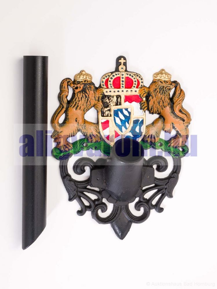 Díszes zászlórúd tartó öntöttvas fali zászlótartó koronás díszitéssel