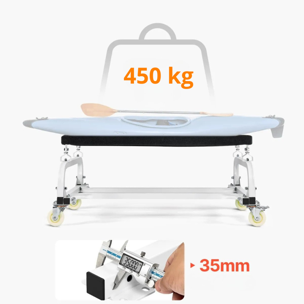 Ez a strapabíró jetski- és kajakszállító kocsi ideális választás kisebb és közepes méretű vízi járművek – például jetskik, kajakok, gumicsónakok és vitorlások – biztonságos és kényelmes mozgatásához. A 454 kg teherbírású acélszerkezet, a filccel borított fektetőcsövek, valamint a fékes, forgó nylonkerekek kiváló stabilitást, sérülésvédelmet és egyszerű kezelhetőséget biztosítanak akár telephelyen, csúsztatáskor vagy tárolásnál is. A több fokozatban állítható magasság és távolság lehetővé teszi a szállítókocsi testreszabását különböző hajóformákhoz.