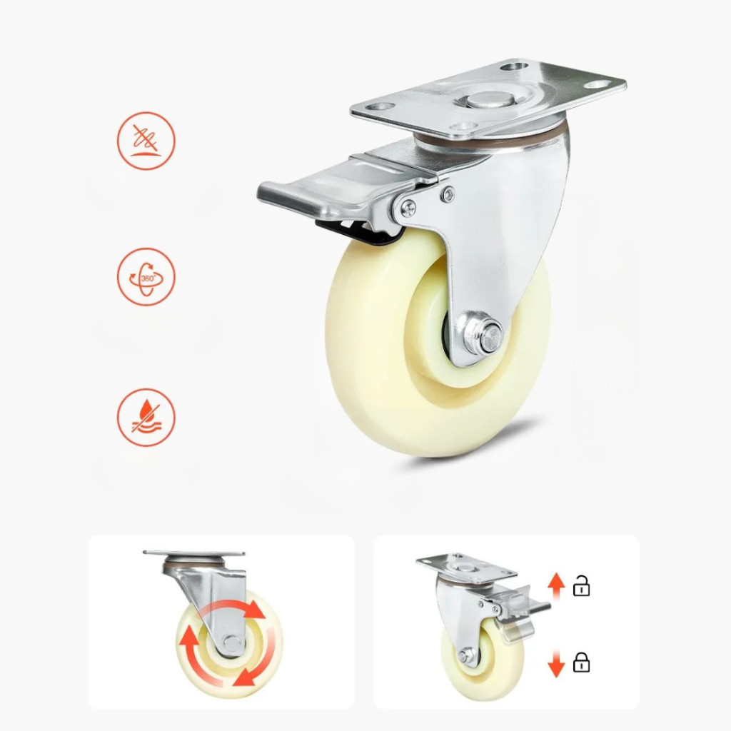 4 darab 122 mm átmérőjű nylonkerék – ebből kettő fékezhető, irányítható kivitel