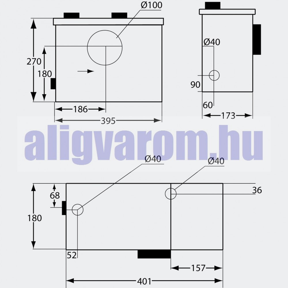 A fürdőszoba, konyha vagy WC szennyvízének átemelésére szolgáló szivattyú. A 110 mm WC bekötés a nagyobbik oldalon, a kisebb, 40 mm-es a keskenyebbik oldalán van. A nyomóág a tetején. Ha olyat keses, amelyik szűk helyre is befér, javasoljuk keressen a WT450 típusjelűt, annak mindkét befolyó a keskenyebb oldalán van.