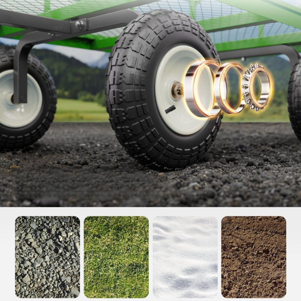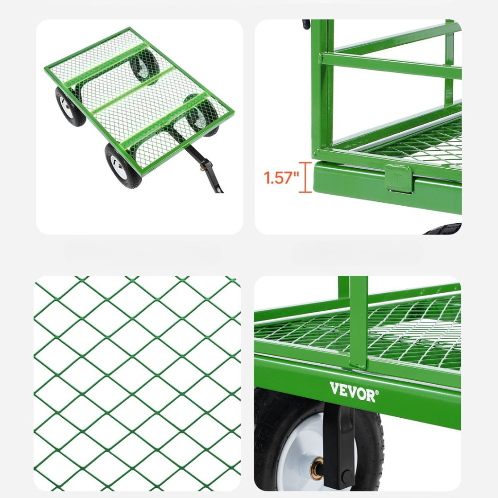 A Q235 típusú acélváz, a porszórt korrózióálló felület, valamint a 13 colos gumigumik fémbetéttel tartóssá és jól irányíthatóvá teszik a kocsit. Akár sáros, havas vagy sziklás terepen dolgozik, ez a kézikocsi minden környezetben megállja a helyét.