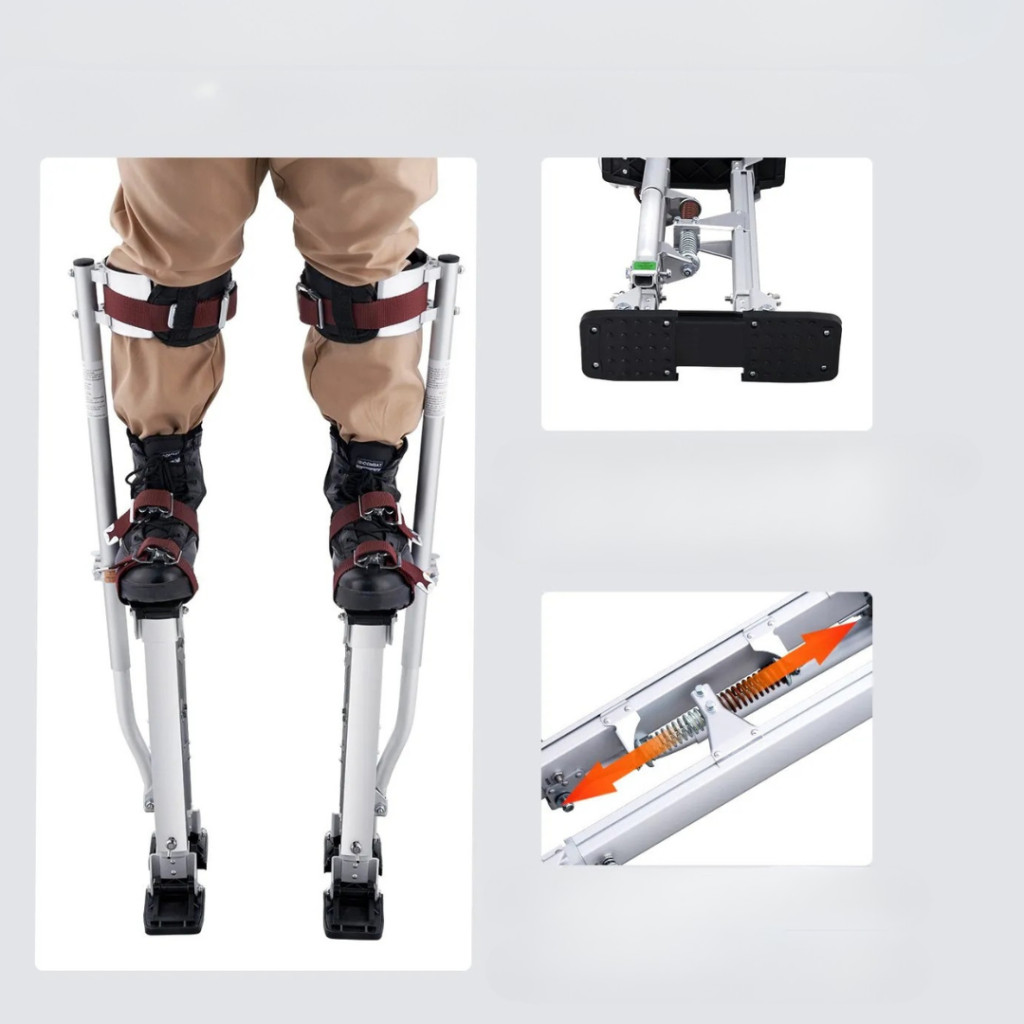 A munkastelázs párnázott PVC térdpántokkal és erős, tartós rögzítőszíjakkal rendelkezik, amelyek biztosítják, hogy lábai kényelmesen és stabilan rögzüljenek. A beépített kettős rugós rendszer segíti az egyensúly megőrzését járás közben, így önállóan is stabilan állhat rajta. Ez a technológia különösen hasznos, ha hosszabb ideig kell magasban dolgoznia.