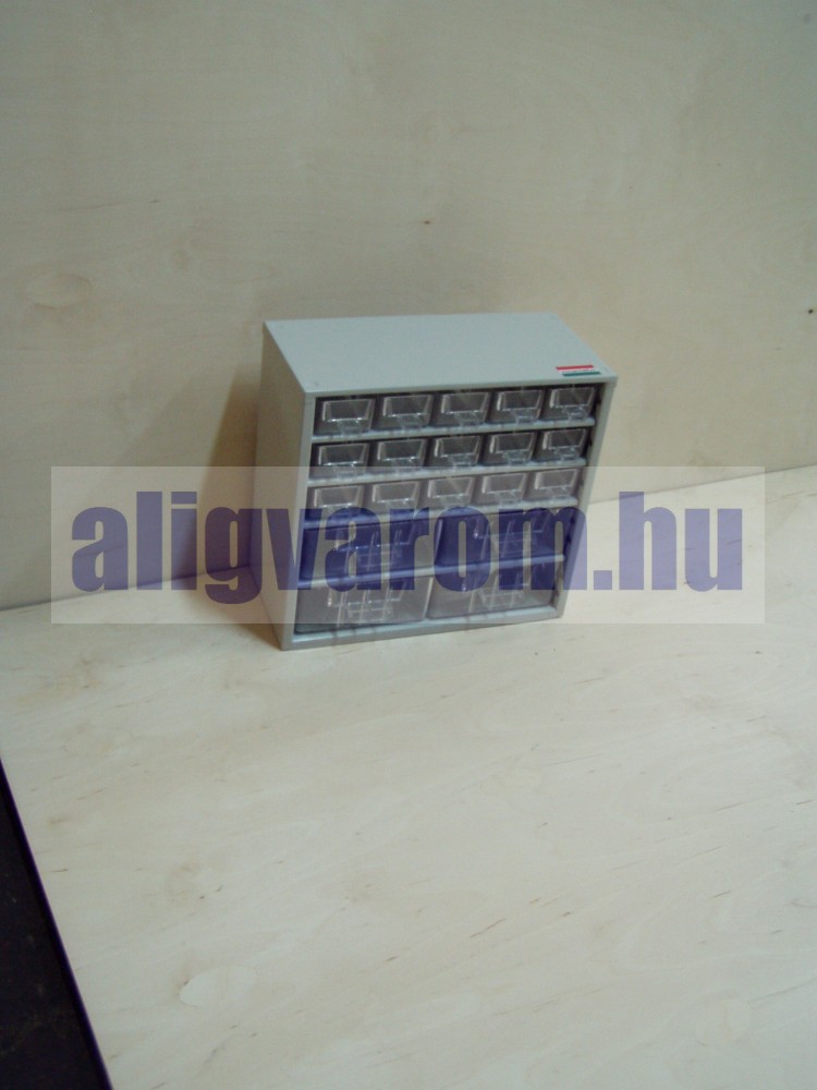 Szortimenter 30x28 cm, fémházas alkatrész tároló fiókos szekrény, 4 közepes és 15 kicsi fiók fiókos tároló, kötőelem tartó doboz