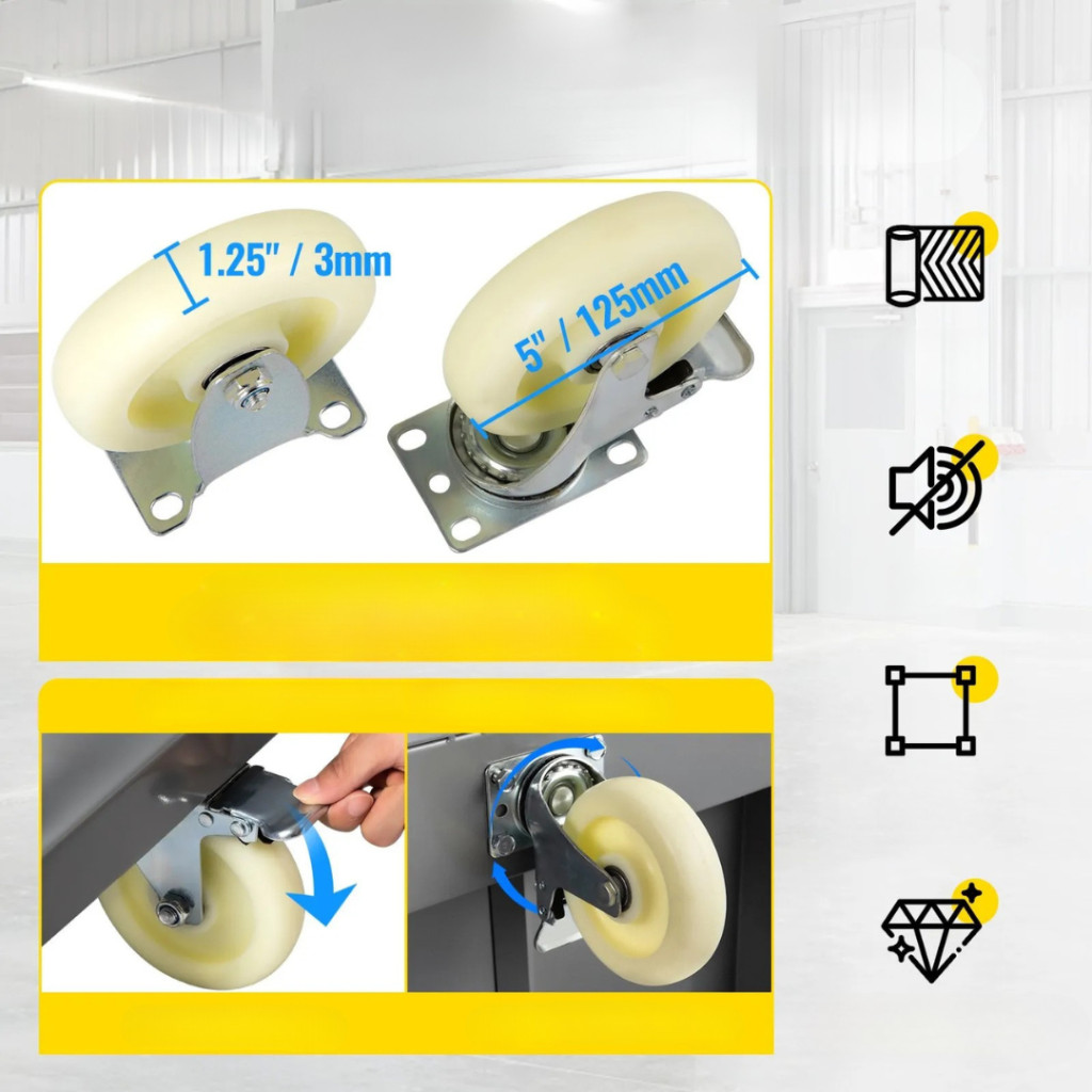 A kocsi négy darab 125 mm átmérőjű PU kerékkel van felszerelve, amelyek sima, halk és biztonságos mozgatást tesznek lehetővé. A két forgókerék 360°-ban elfordítható, így a szállítókocsi könnyedén irányítható szűk helyeken is.