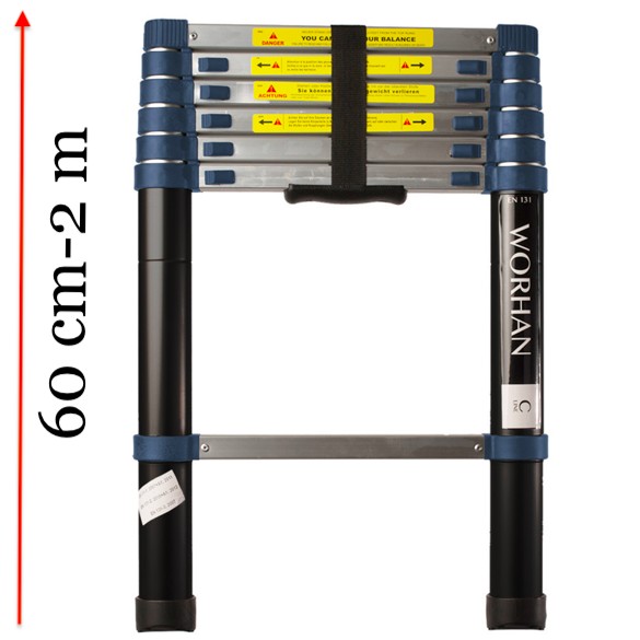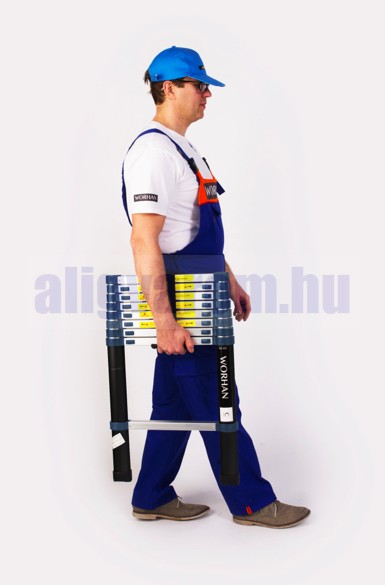 2 m magas, kihúzható létra, teleszkópos alumínium létra 60 cm-re összecsukható. Gumírozott talppal ellátva.