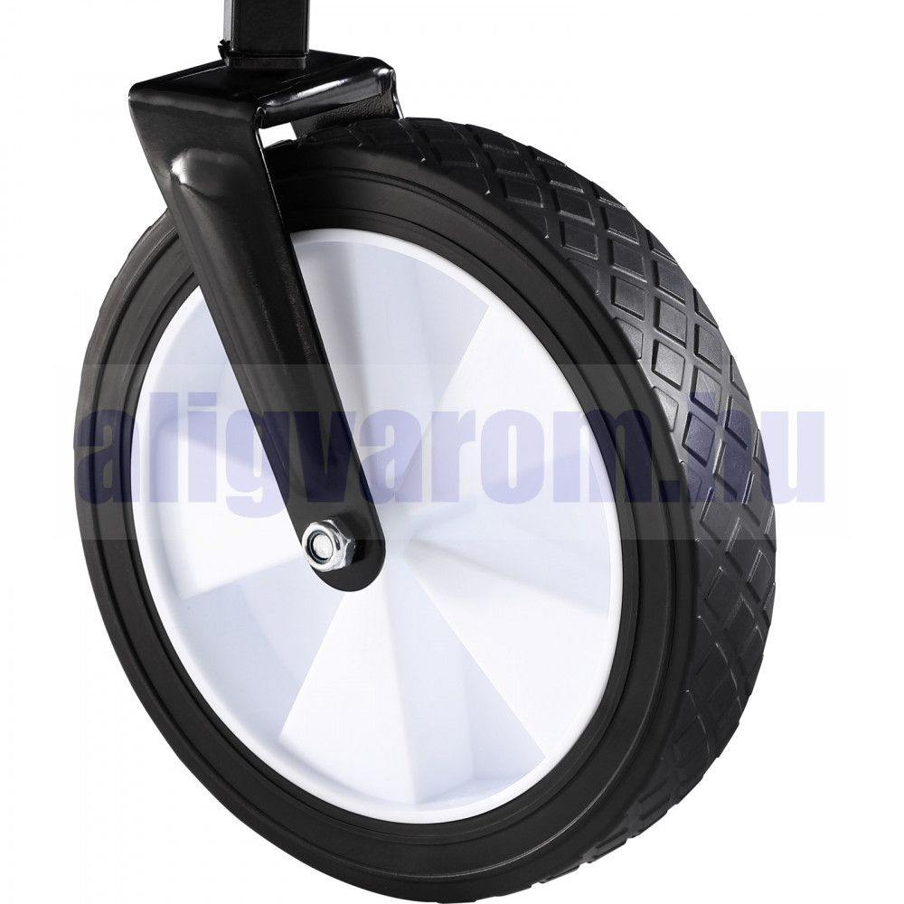 A tömör gumiabroncs további stabilitást biztosít a kézikocsinak. Ezenkívül a kocsi mindkét első kereke 360°-ban elfordítható.