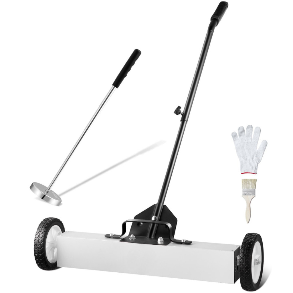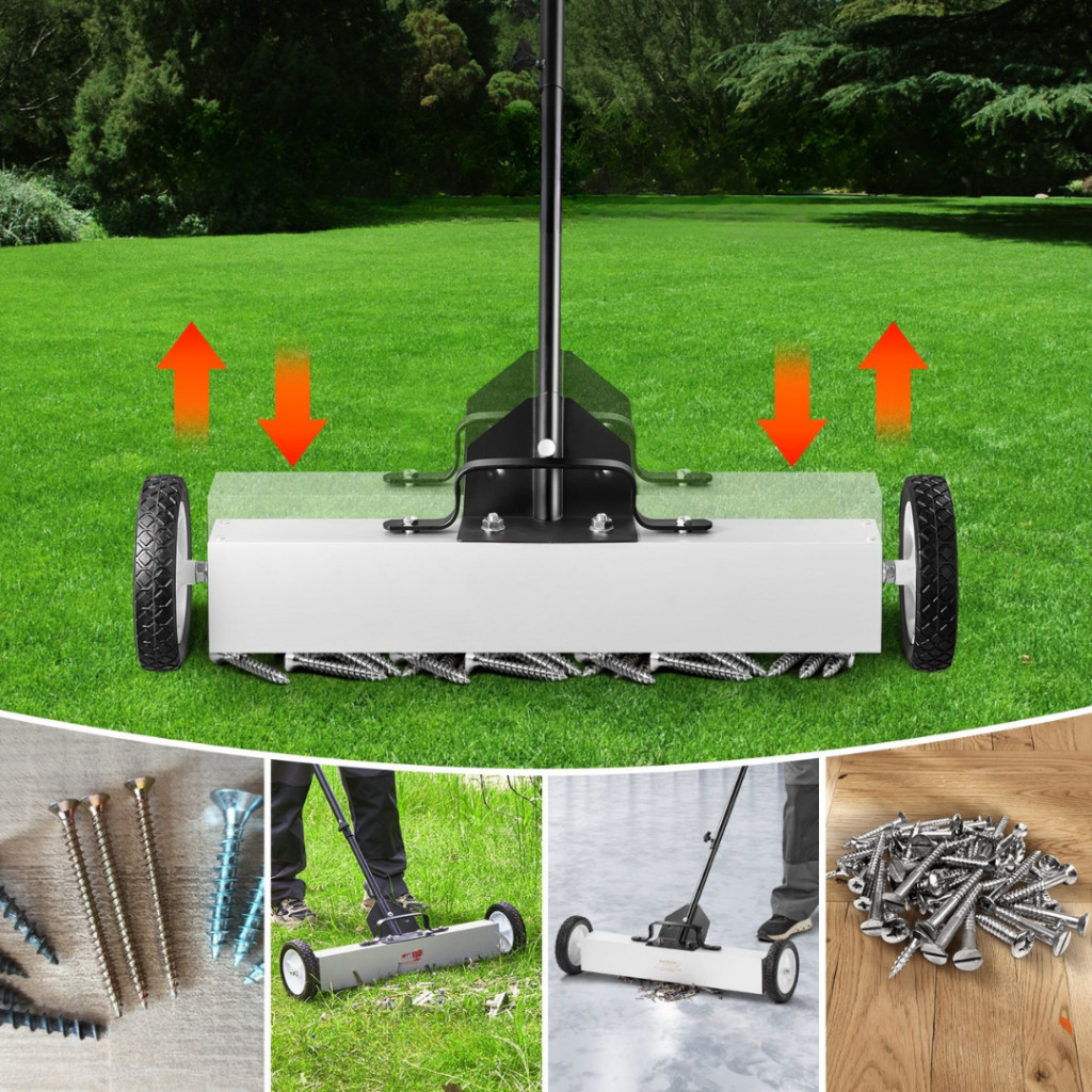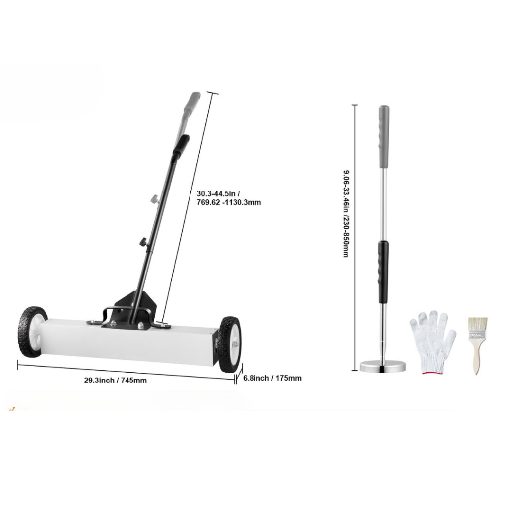 A gurulós mágneses seprű kiválóan alkalmas kisebb és nagyobb fémhulladékok összegyűjtésére. A 61 cm széles mágneses fej akár 22,6 kg fémtárgyat is képes felemelni, míg a kompakt, 8 cm széles teleszkópos mágneses rúd 15,9 kg terhelhetőséggel ideális precíziós tisztítási feladatokra.