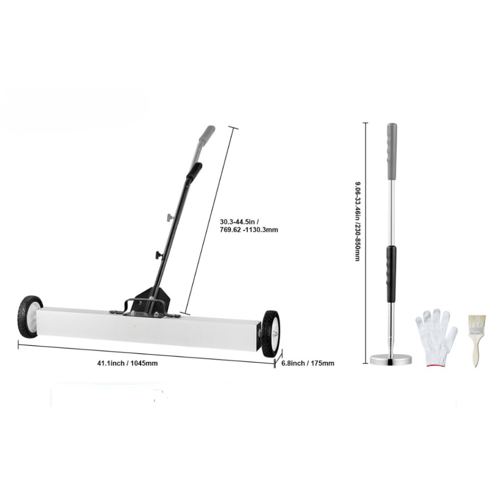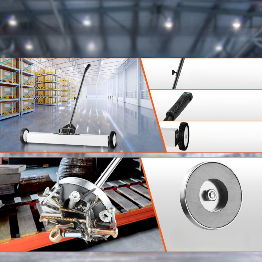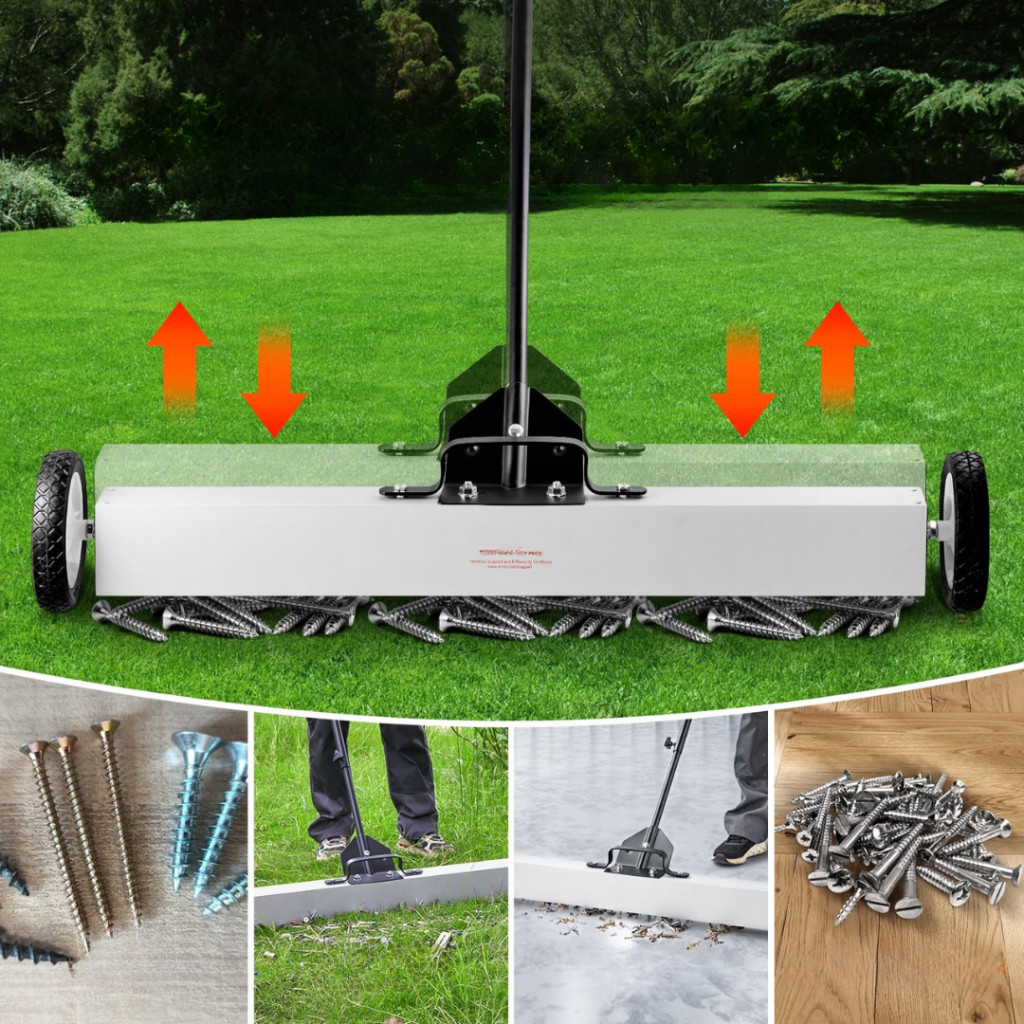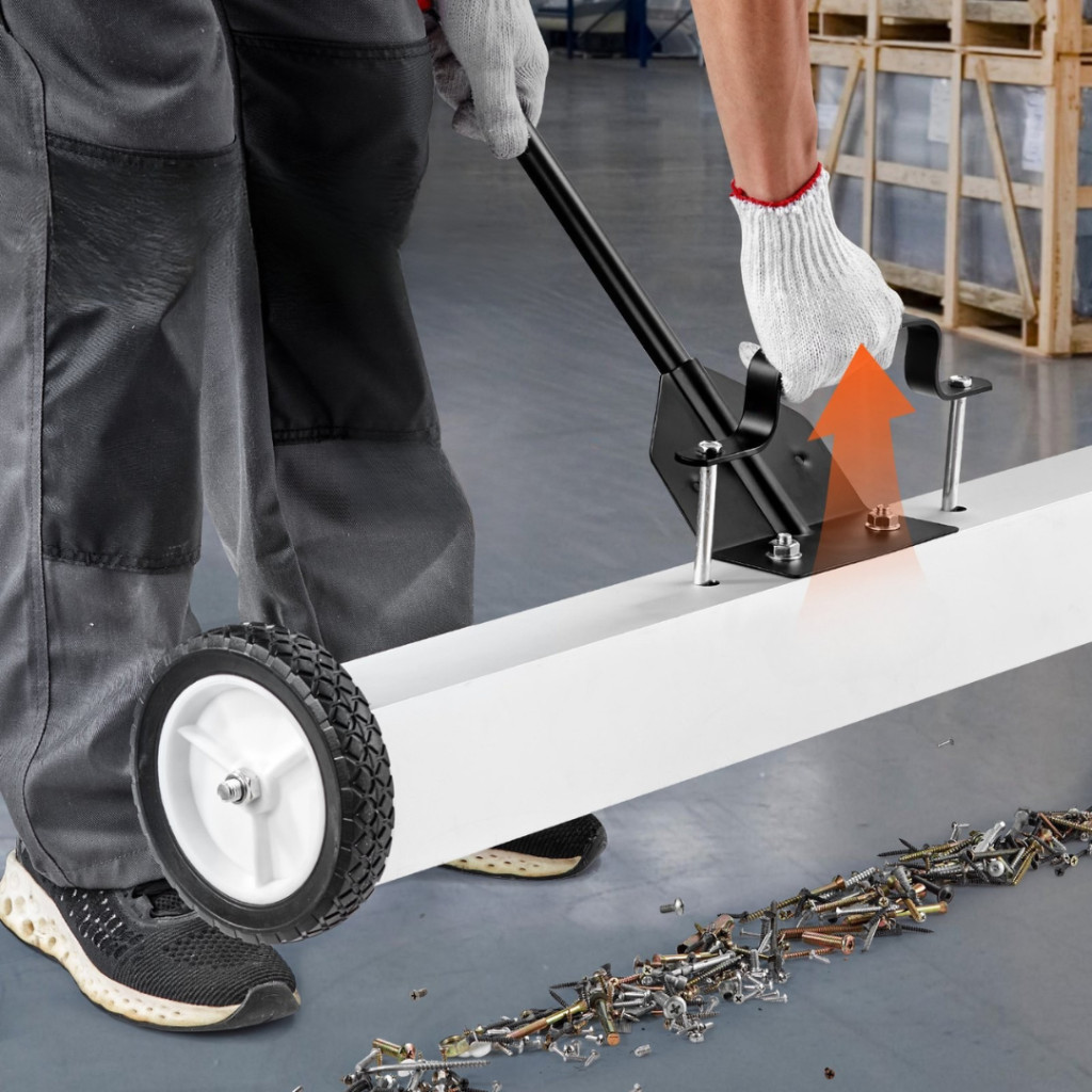 A 91 cm széles mágneses seprőgép ideális választás műhelyek, garázsok, ipari létesítmények vagy építkezések számára. A nagy teljesítményű mágnes akár 25 kg fémhulladékot is könnyedén összegyűjt, így hatékonyan eltávolíthatja a szegeket, csavarokat és fémtörmeléket a padlóról, fűről vagy kavicsos felületekről.