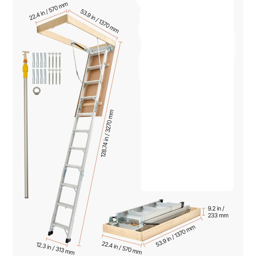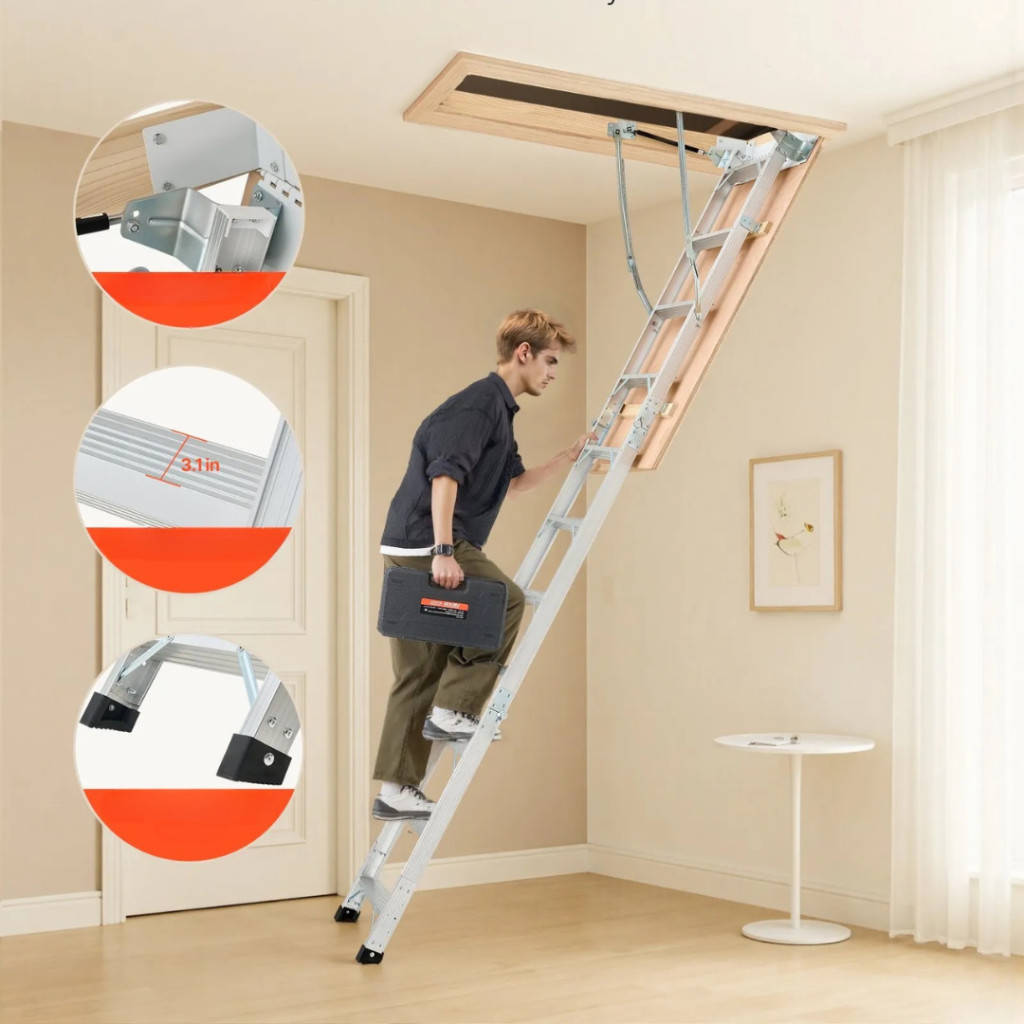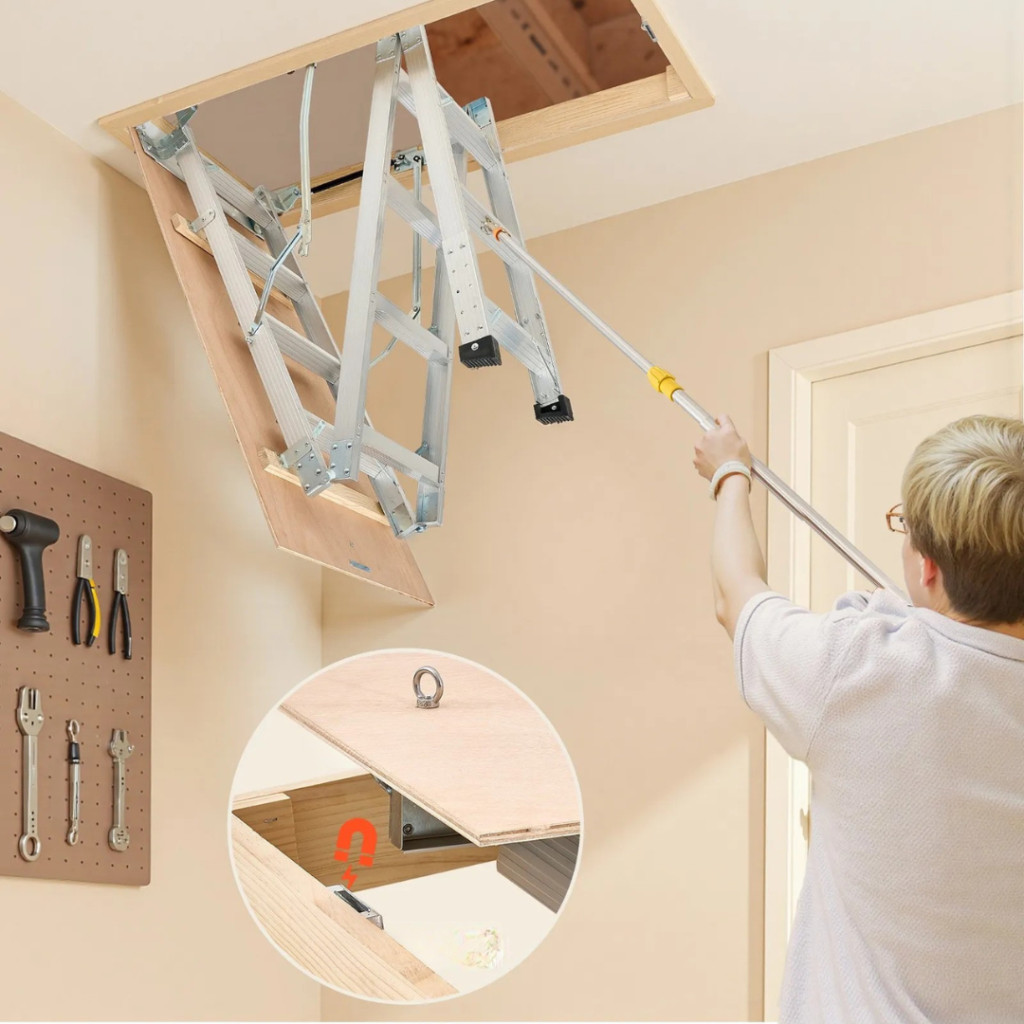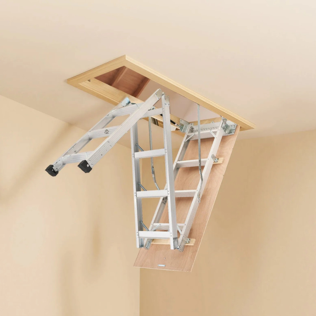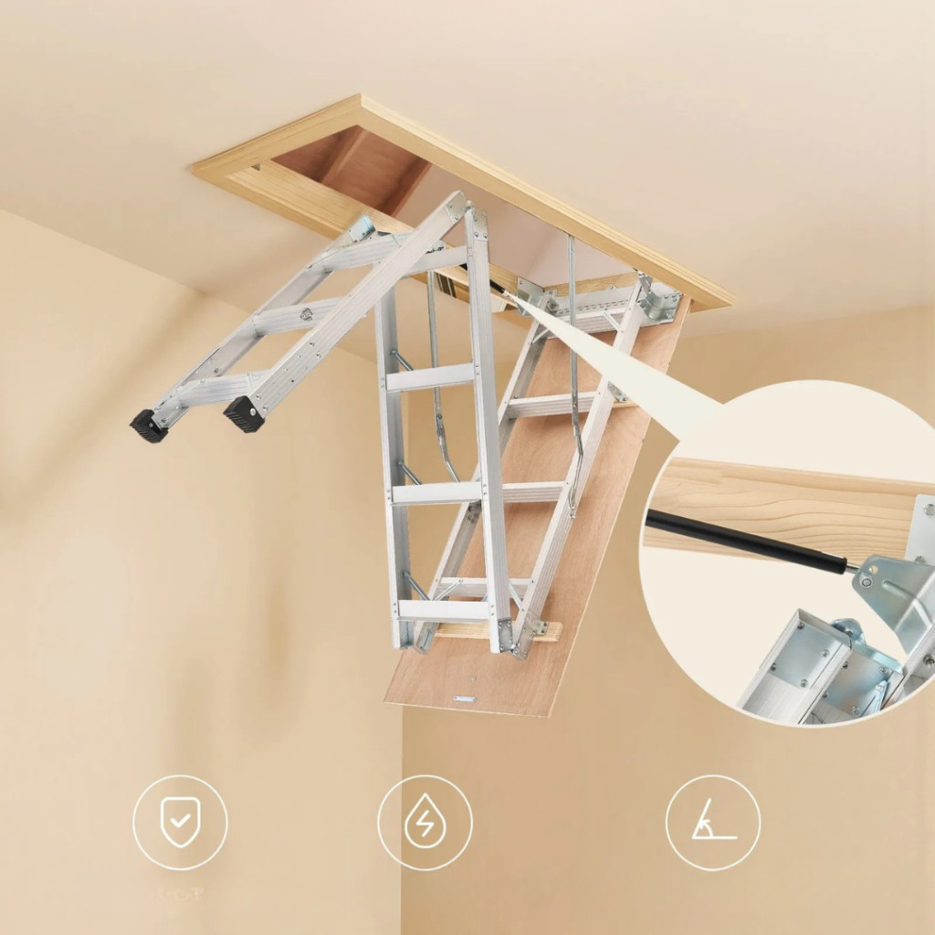 A padláslépcső 3,0–3,13 méteres mennyezetmagasságig állítható, így könnyen illeszthető a legtöbb otthoni és ipari környezethez. Két kivehető fok segítségével pontosan beállítható a kívánt hossz, a csúszásmentes, állítható lábakpedig stabil tartást biztosítanak bármilyen padlófelületen. A szereléshez mindössze egy 137 x 57 cm-es nyílás szükséges, amelybe a lépcső egyszerűen beilleszthető és rögzíthető.