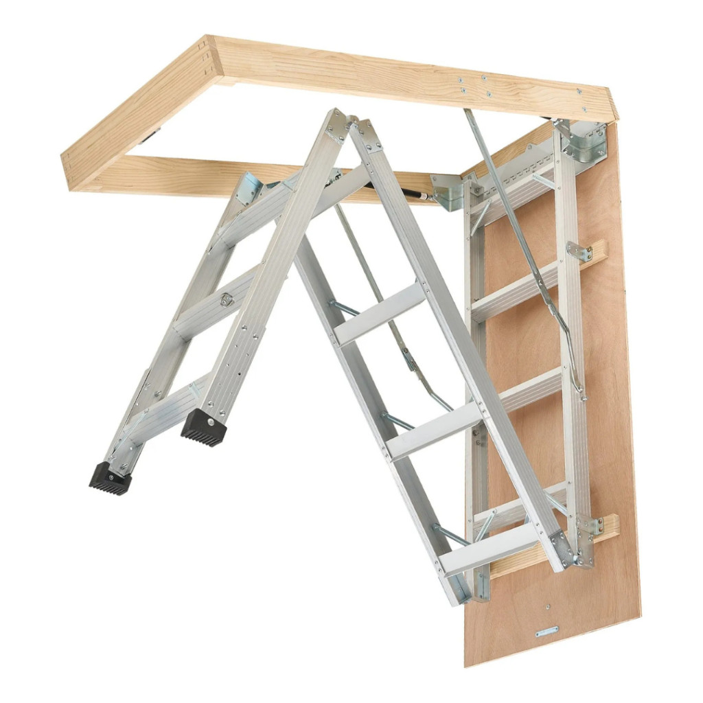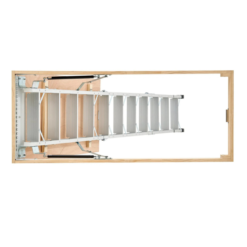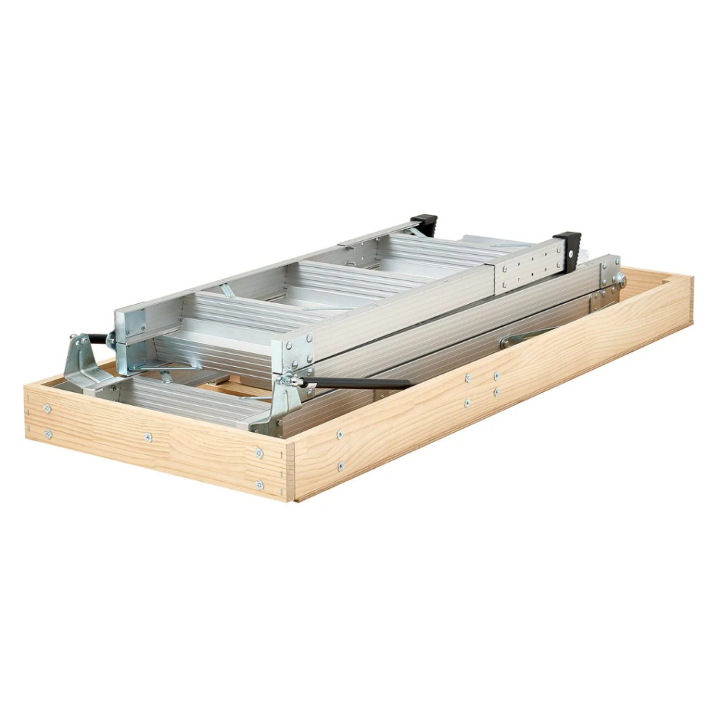 Összecsukott állapotban a lépcső mindössze 137 x 57 x 23 cm helyet igényel, így minimális helyet foglal. A 139–144 cm hosszúságú padlásnyílás elegendő a kényelmes közlekedéshez, miközben a lépcső diszkréten elrejthető a mennyezetben. Tökéletes választás kis lakásokba, padlásokba, loft terekbe vagy emeleti erkélyekhez.