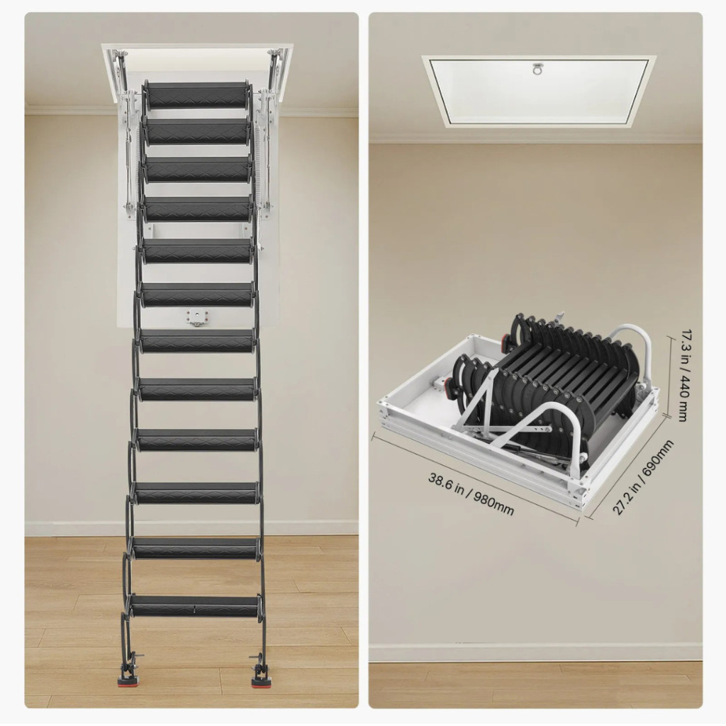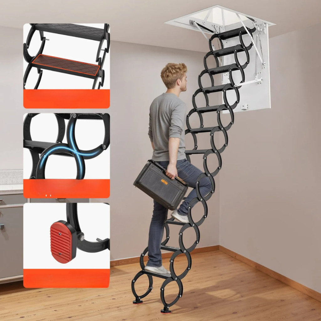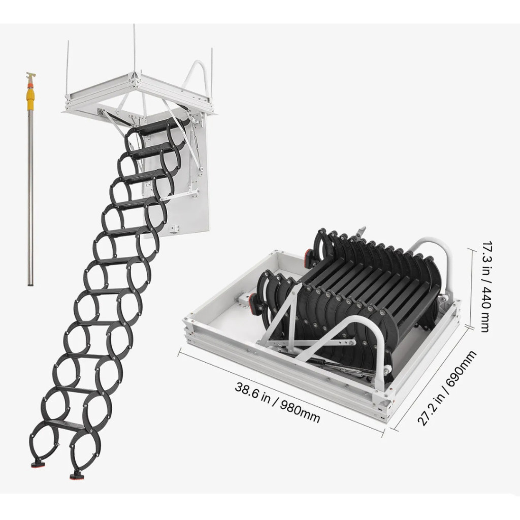 Összecsukva a lépcső mindössze 980 x 690 x 440 mm helyet foglal, így kis terekbe is ideális. A 139–145 cm hosszú padlásnyílás kényelmes mozgást tesz lehetővé, miközben a szerkezet ollós kialakítása minimális helyet igényel a kihajtás során. Ideális megoldás raktárakba, családi házakba, galériás lakásokba vagy műhelyekbe.