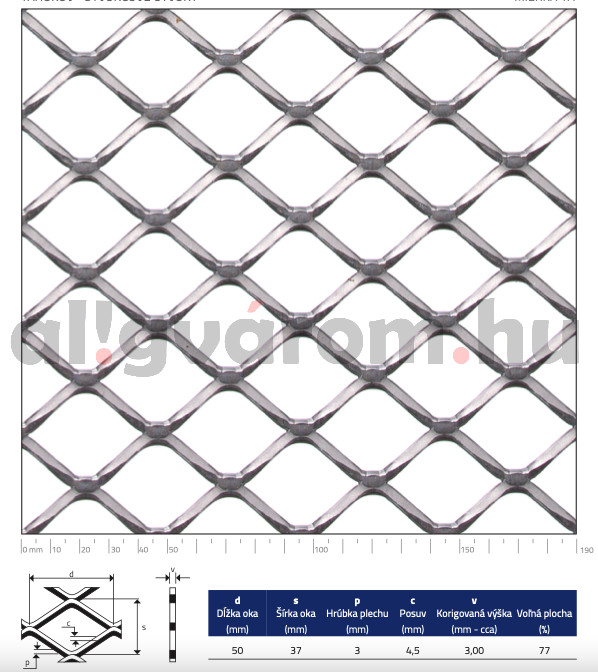 Perforált lemez acél 1000x2000 mm tábla 50x37 mm lyuk négyzet alakú osztással 77%-os áteresztő felülettel