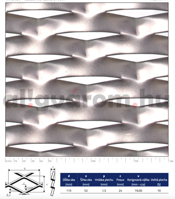 Perforált lemez acél 2000X1500 mm tábla 115x52 mm lyuk rombusz alakú osztással 10%-os áteresztő felülettel