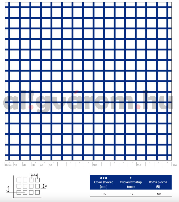 Perforált lemez acél 1000x2000x1,5 mm tábla 10x10 mm lyuk hálós osztással Szabad áteresztő felület: 69%