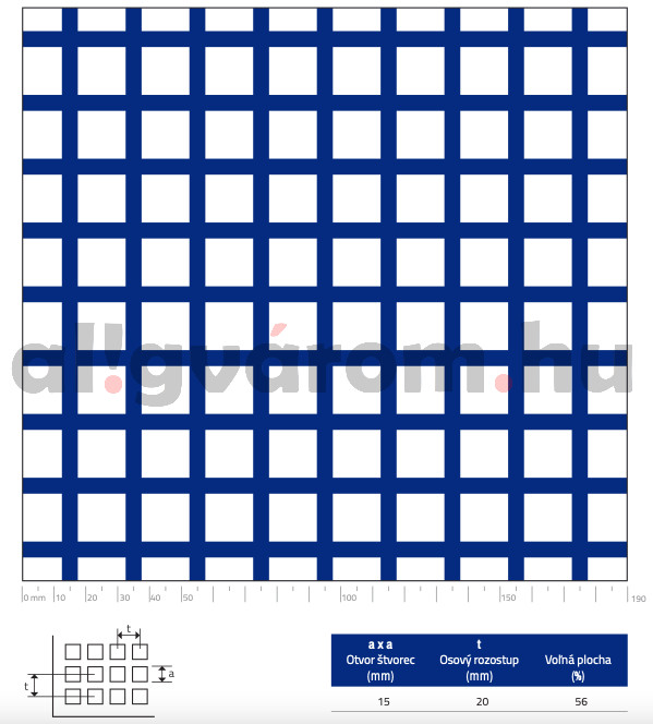 Perforált lemez acél 1000x2000x1,5 mm tábla 15x15 mm lyuk hálós osztással Szabad áteresztő felület: 56%
