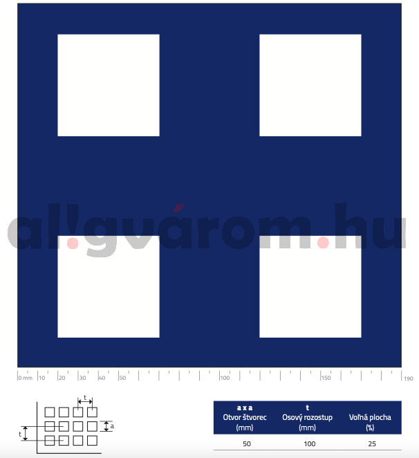 Perforált lemez acél 1000x2000x2 mm tábla 50x50 mm lyuk hálós osztással Szabad áteresztő felület: 25%