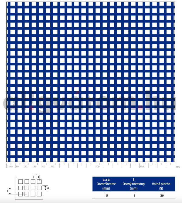 Perforált lemez acél 1000x2000x1,5 mm tábla 5x5 mm lyuk hálós osztással Szabad áteresztő felület: 39%