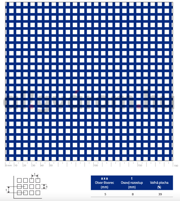 Perforált lemez acél 1000x2000x1 mm tábla 5x5 mm lyuk hálós osztással Szabad áteresztő felület: 39%