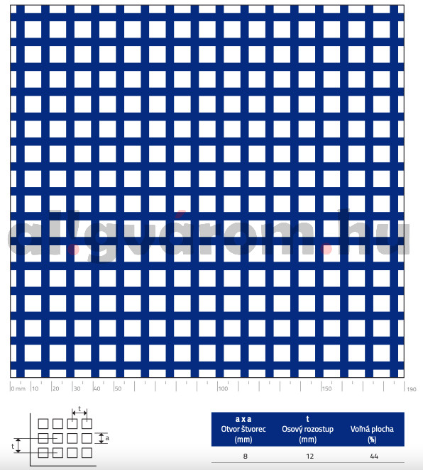 Perforált lemez acél 1000x2000x1 mm tábla 8x8 mm lyuk hálós osztással Szabad áteresztő felület: 44%