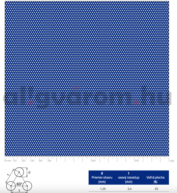 Perforált lemez acél 1000x2000x1 mm tábla 1,25 mm lyuk kör alakú osztással Szabad áteresztő felület: 25%