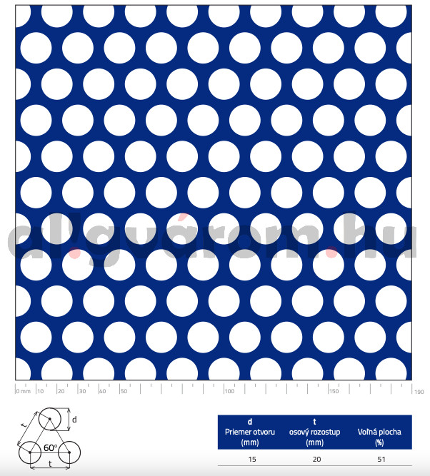 Perforált lemez acél 1000x2000x1,5 mm tábla 15 mm lyuk kör alakú osztással 51%-os áteresztő felülettel