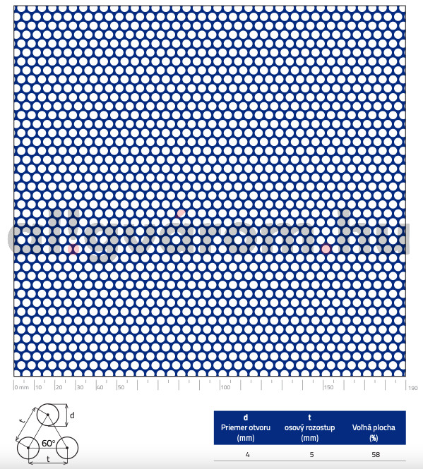 Perforált lemez acél 1000x2000x1 mm tábla 4 mm lyuk kör alakú osztással 58%-os áteresztő felülettel
