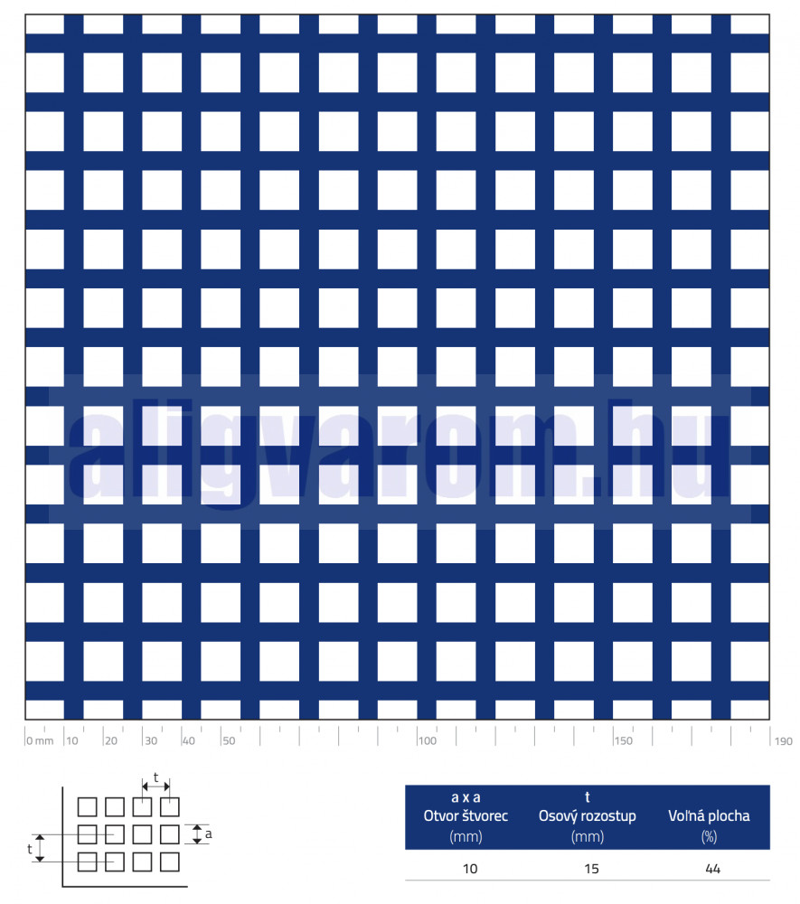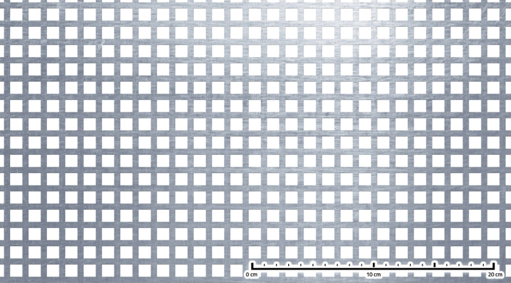 Perforált lemez rozsdamentes acél 1000x2000x1 mm tábla 10x10 mm lyuk hálós osztással Szabad áteresztő felület: 45% saválló inox