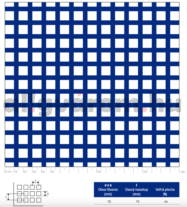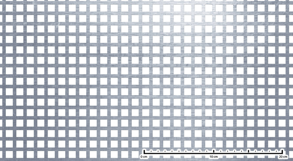 Perforált lemez rozsdamentes acél 1250x2500x1,5 mm tábla 10x10 mm lyuk hálós osztással Szabad áteresztő felület: 45% saválló inox