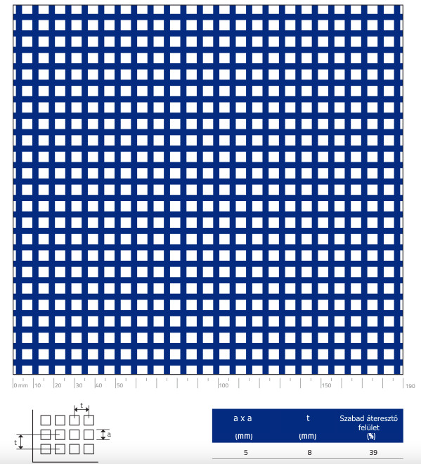 Perforált lemez rozsdamentes acél 1000x2000x1,5 mm tábla 5x5 mm lyuk hálós osztással Szabad áteresztő felület: 39% saválló inox